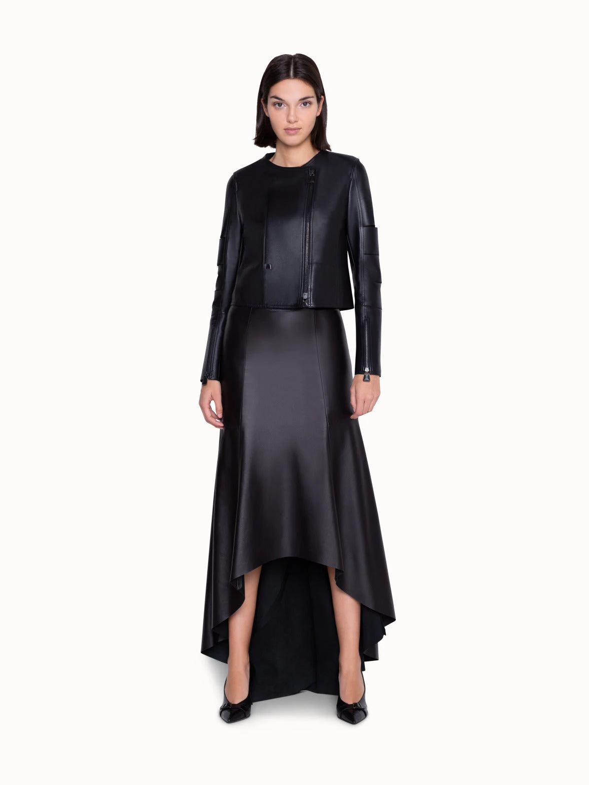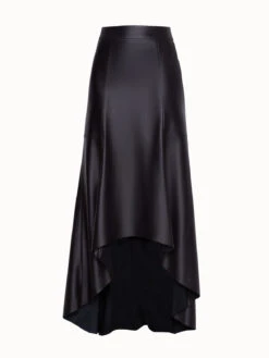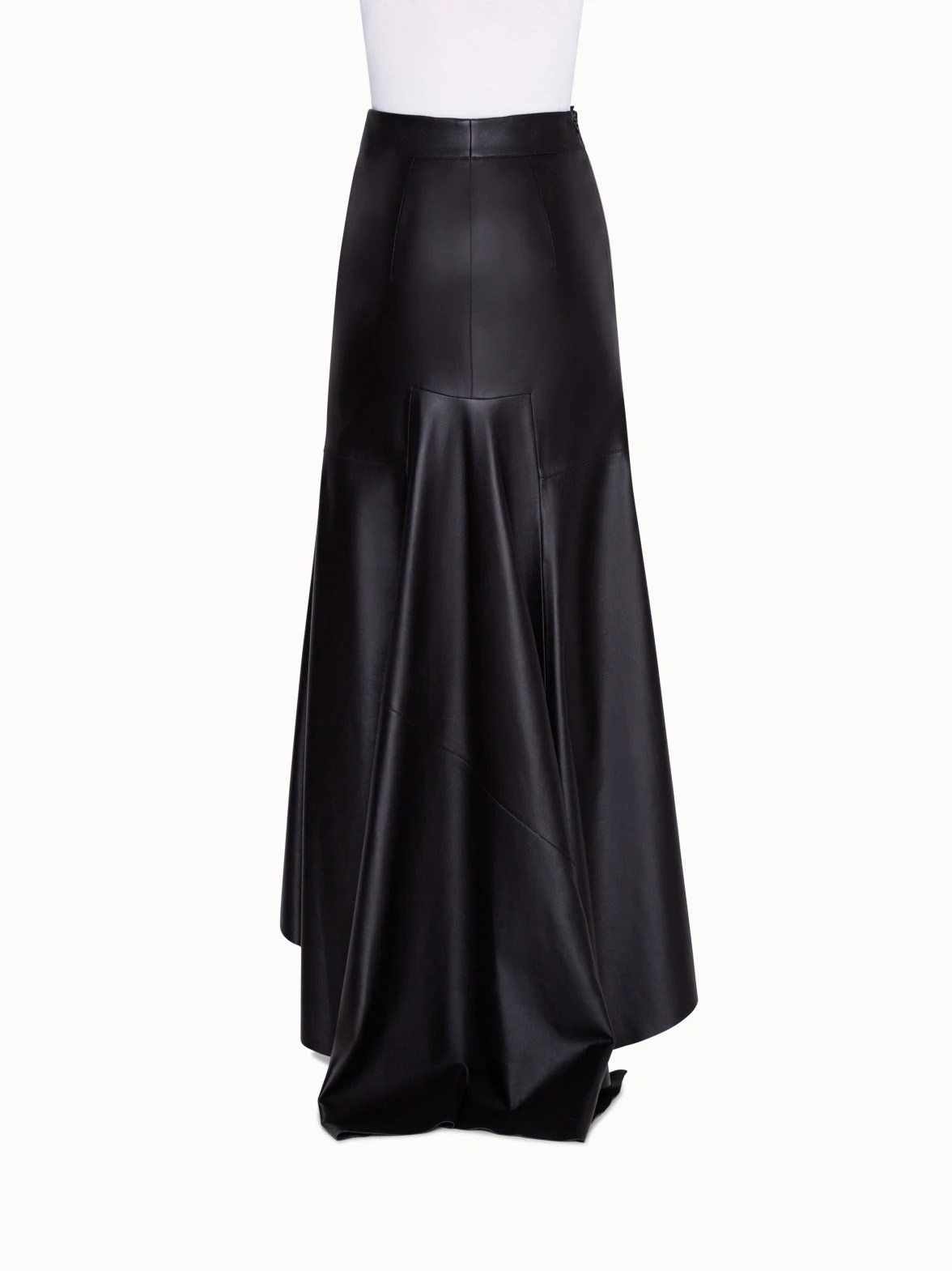 A long skirt to flatter your silhouette. With its A-line form, this skirt made of lamb nappa leather will complete your look in style. The asymmetrical hem is in the akris signature trapezoidal form. Pair it with a leather jacket for a casual yet elegant look.