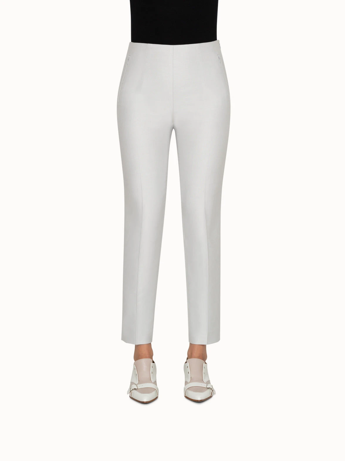 A soft feeling for your legs with this pants in cotton silk. Thanks to its ankle lenght, your favorite shoes will be highlighted. The slim leg will also flatter your silhouette Features zip pockets and a size zip.