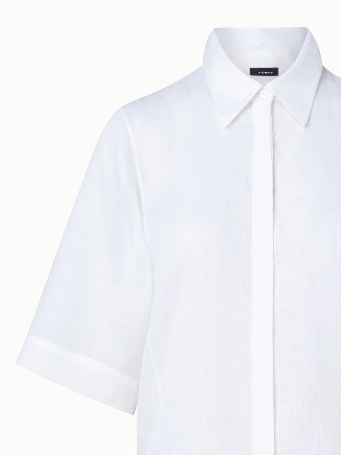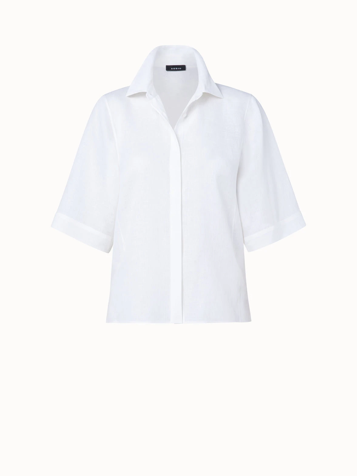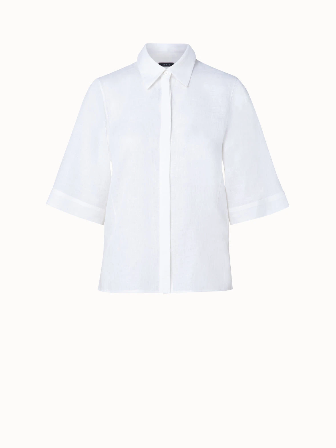 This Akris blouse is crafted in linen voile, giving it a lightweight feel and tactile structure. It features a slightly boxy fit, elbow-length sleeves, and hem slits that create a modern yet sophisticated look. A shirt collar and covered button placket complete this style.