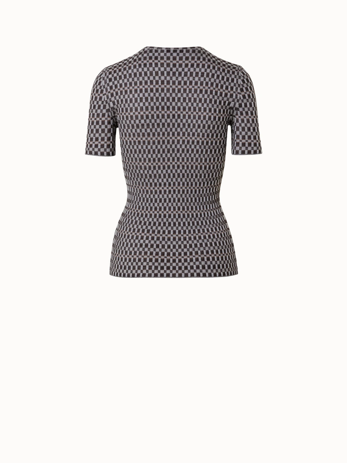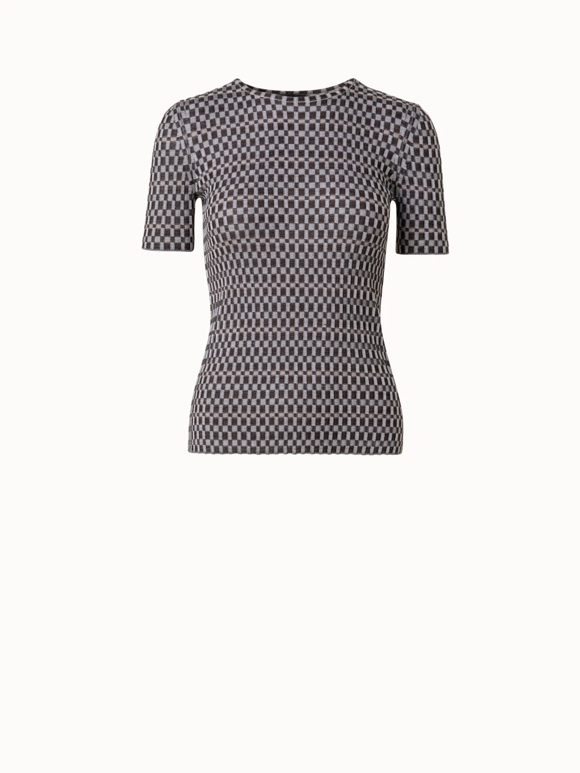 This Akris pullover is crafted in a structured check silk knit, creating a comfortable and elegant style that is perfect for spring and summer. The round neck, fitted silhouette, and short sleeves make it ideal for layering or as a versatile standalone piece.
