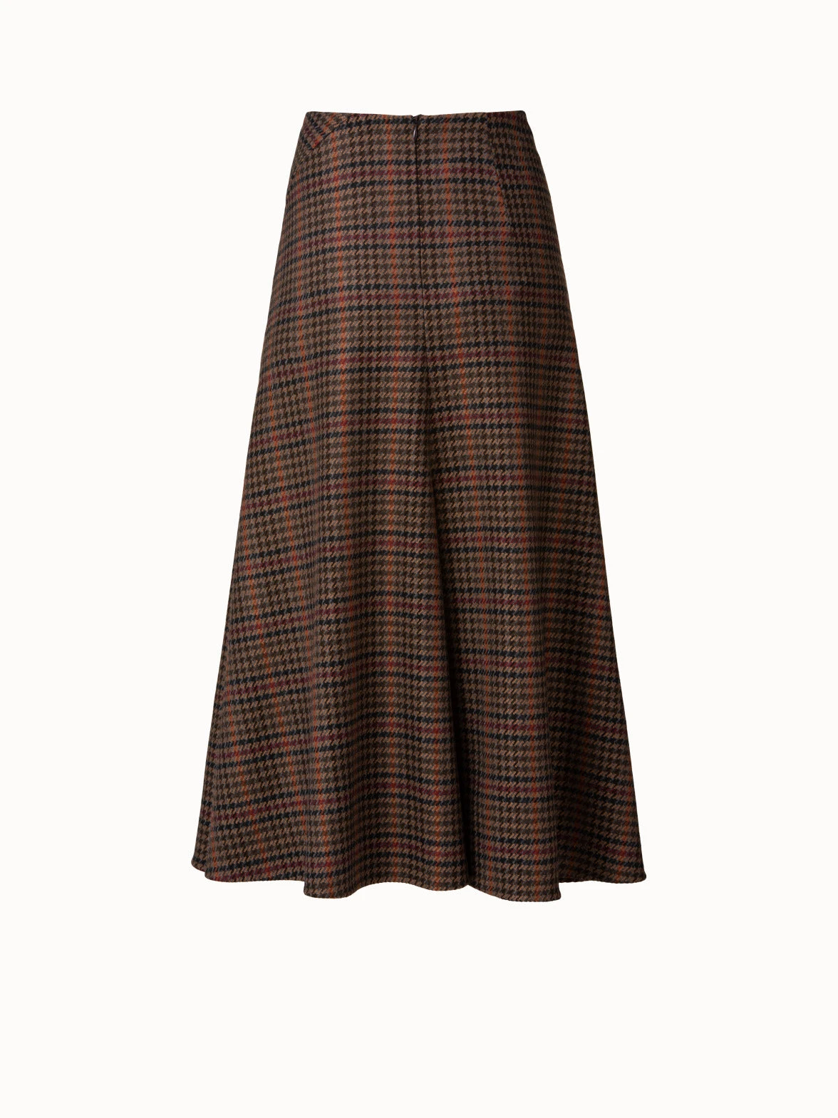 This Akris midi skirt is crafted in checked wool. It features a voluminous flared godet cut that pairs perfectly with formal jackets, coats, and knits.