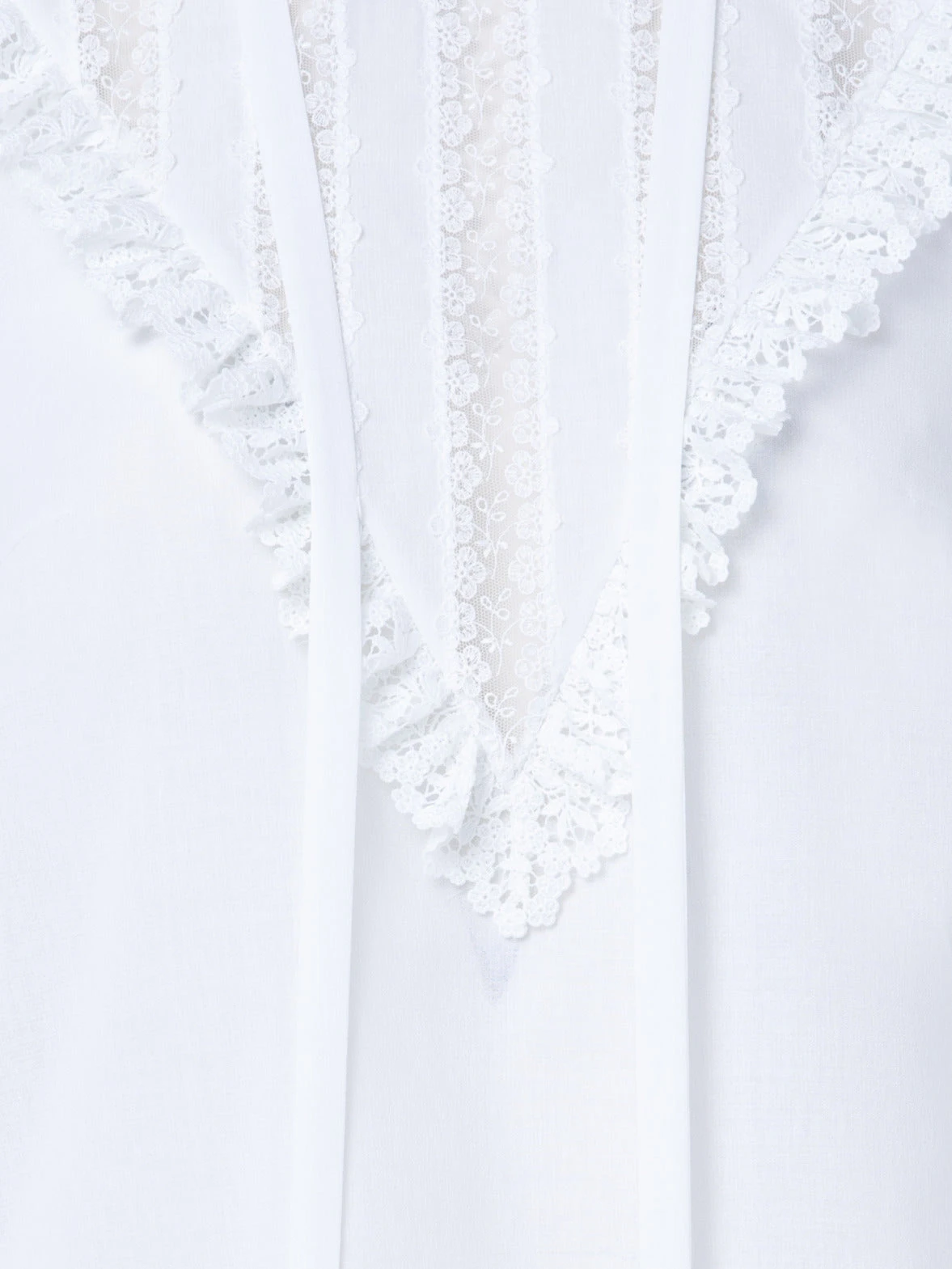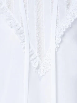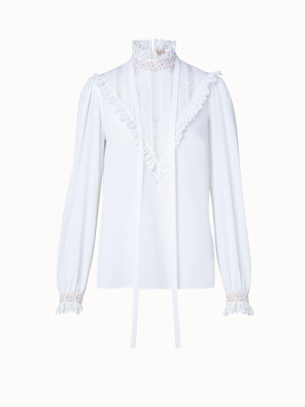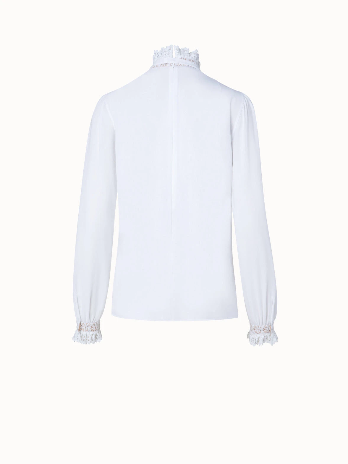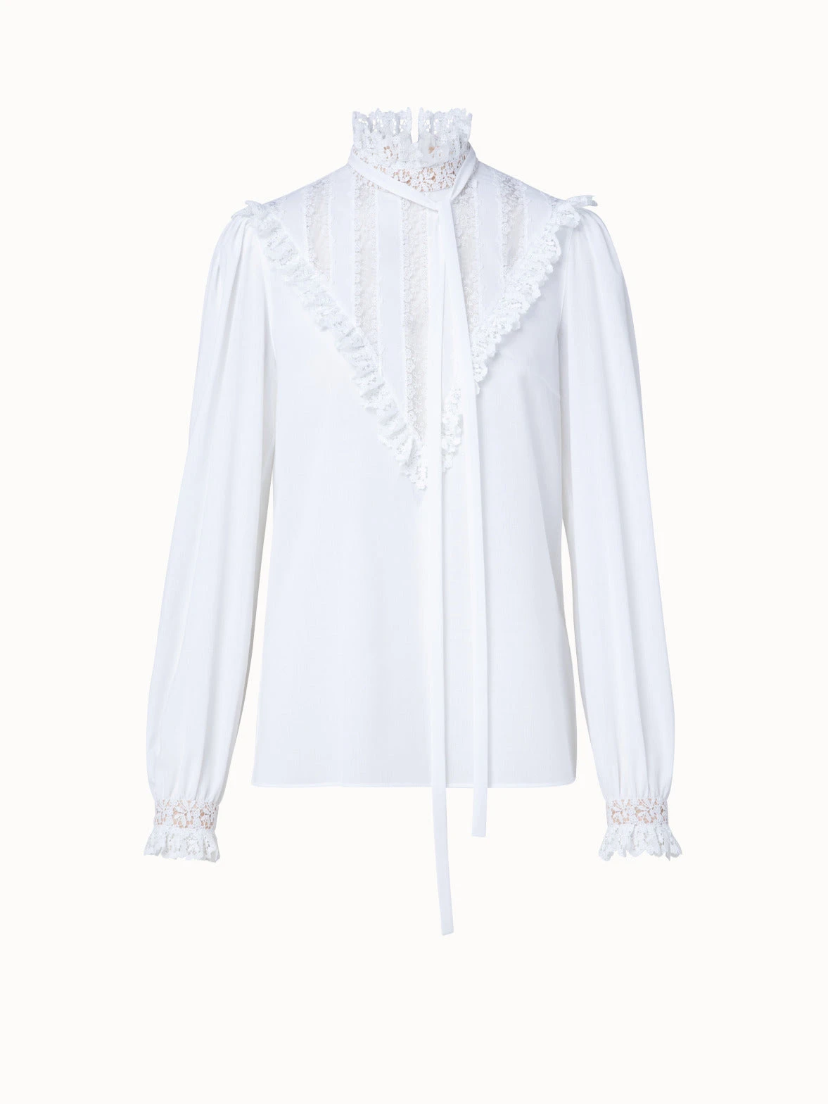 This Akris blouse creates a stand-out look with its lace collar and front inset, ruffled lace cuffs, and gathered shoulders. The tie- ribbon allows for personal styling options. The cotton crêpe construction and relaxed fit create a modern silhouette. Closes with a back zip.