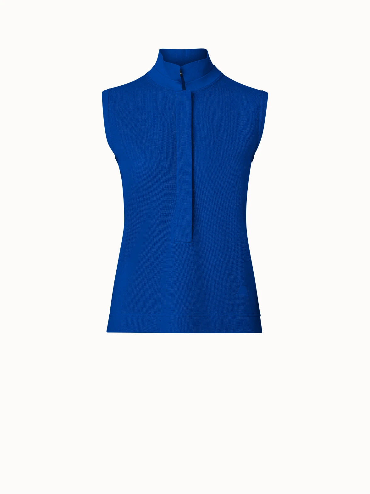 A modern, feminine update to the classic polo shirt, this sleeveless cotton piqué knit top features a stand-up collar and deep, covered button placket that allows for a variable neckline and creates the impression of a shirt when tucked into high-waisted pants or a skirt. This Akris top is cut for a fitted silhouette.
