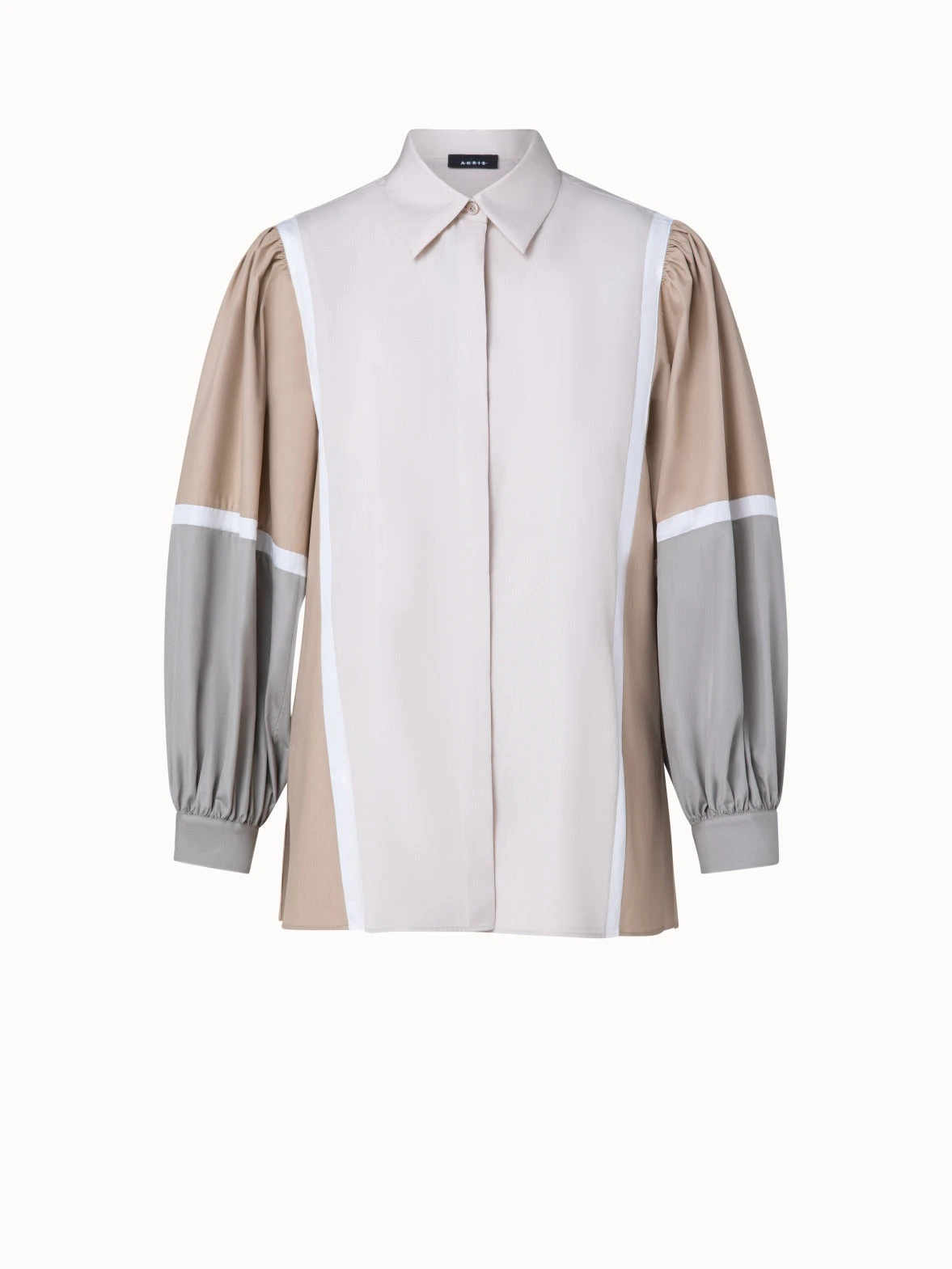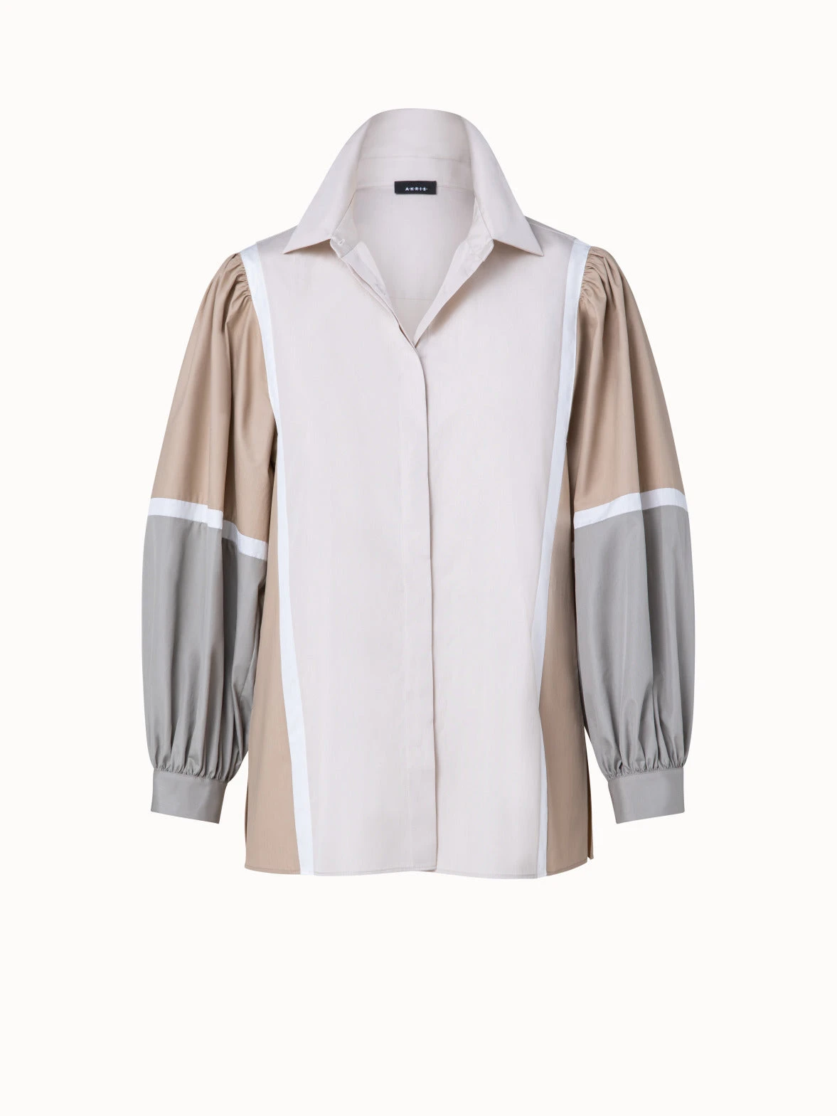 This cotton poplin Akris blouse showcases the vintage inspiration of the Spring 2023 collection in a colorblock patchwork design and volumes that are a reimagination of designs by creative director Albert Kriemler from the 1980s. A shirt collar and covered button placket complete the look.