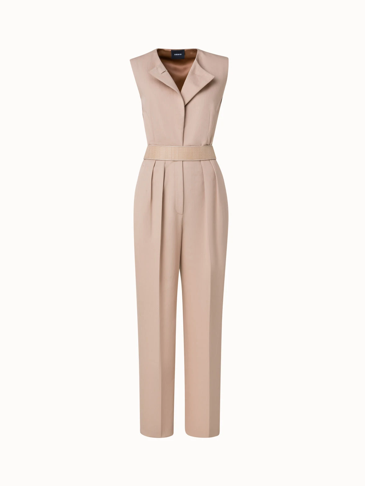 This sleeveless Akris jumpsuit is crafted in cotton silk serge, making it an elegant choice for spring and summer occasions. The gold button and shoulder pads showcase the vintage inspiration of the Spring 2023 collection and create a strong look. Front pleats create a flattering waist that is accentuated by the horsehair belt.