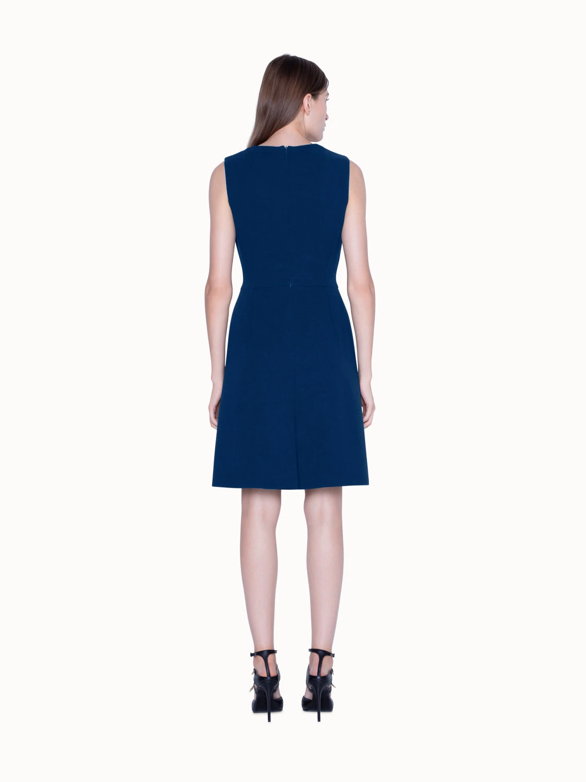 A feminine classic in navy. This Akris sleeveless dress is impeccably made from wool doubel face. Designed in a feminine wrap style and kneelenth A-line. It features a lapel collar with V neck and will take you from your desk to an evening out with its flattering and feminine fit. Wear it with the iconic Akris Ai handbag.