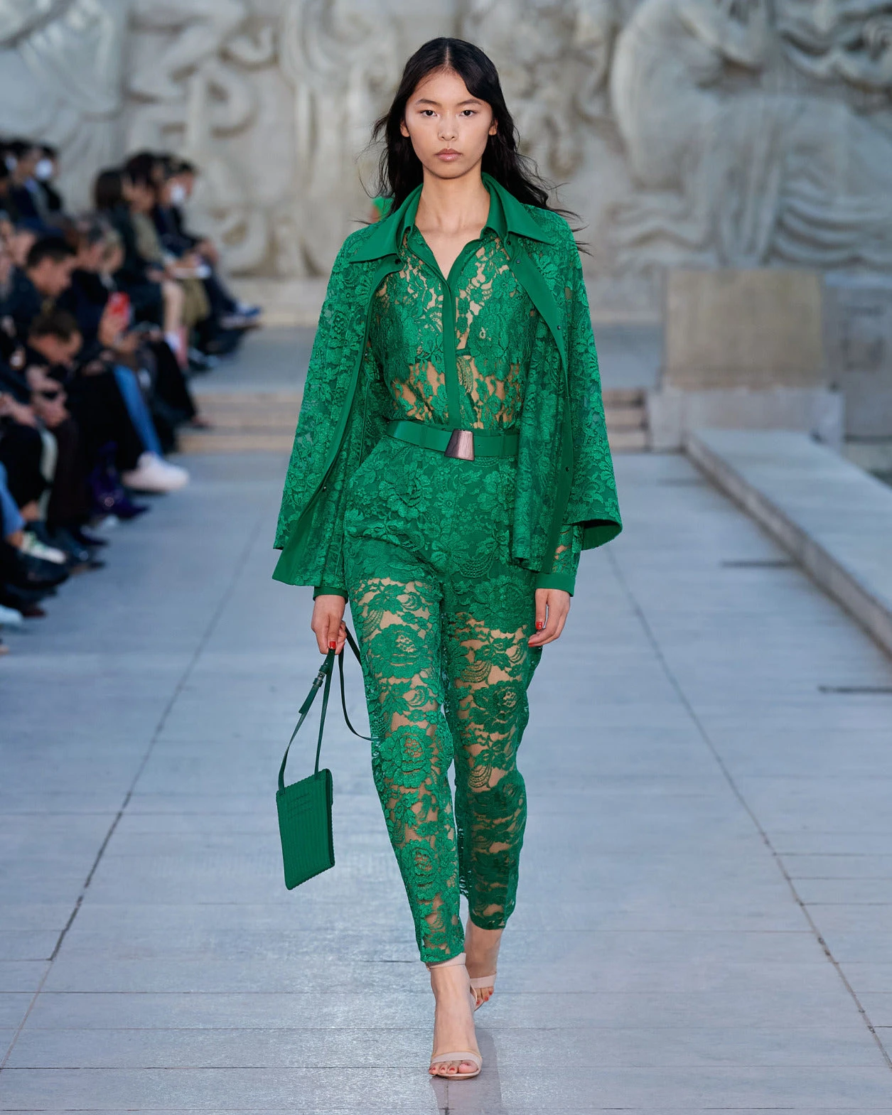 As part of the vintage inspiration of Akris Spring 2023 and the celebration of 100 years Akris, the lace in this collection originates from creative director Albert Kriemler’s designs of the 1980s. They are manufactured by the initial lacemaker in Calais and were re-developed in a six-month process.