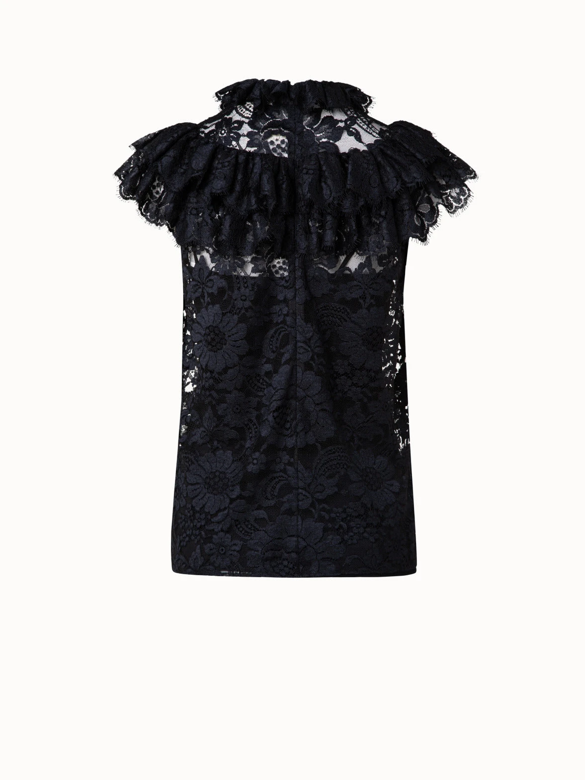 This Akris blouse is crafted in all-over floral lace. It features a ruffled stand-up collar and ruffled shoulders that create a flattering silhouette with a romantic touch.