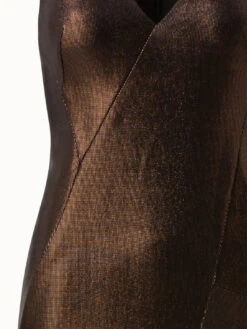 This liquid jersey gown elegantly emphasizes the body with its faux wrap style and falls into a chic a-line silhouette with long train. Designed with a v-neckline and back zip closure. This stunning metallic dress is the perfect choice for the holidays.