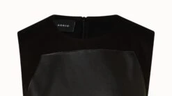 This long dress shows a modern combination of classic fabrics in a new silhouette. The dress is crafted from cotton twill and features a leather apron bodice. Its round neck and timeless silhouette fall to a long flared skirt, making it an impeccably crafted signature piece.