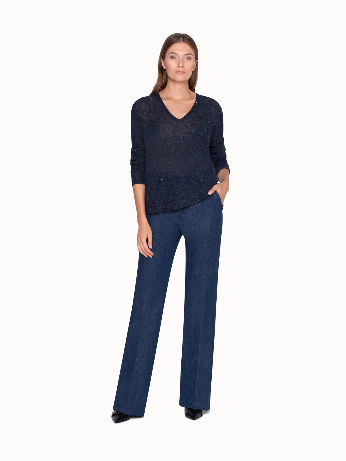 Feel the softness of linen with this designer pullover. The starry design makes it trendy while remaining discreet. Casual elegance at its best. Features a v-neck and will be easy to mix and match, for example with wide leg pants in navy.