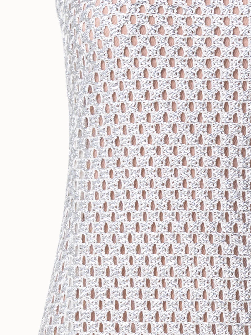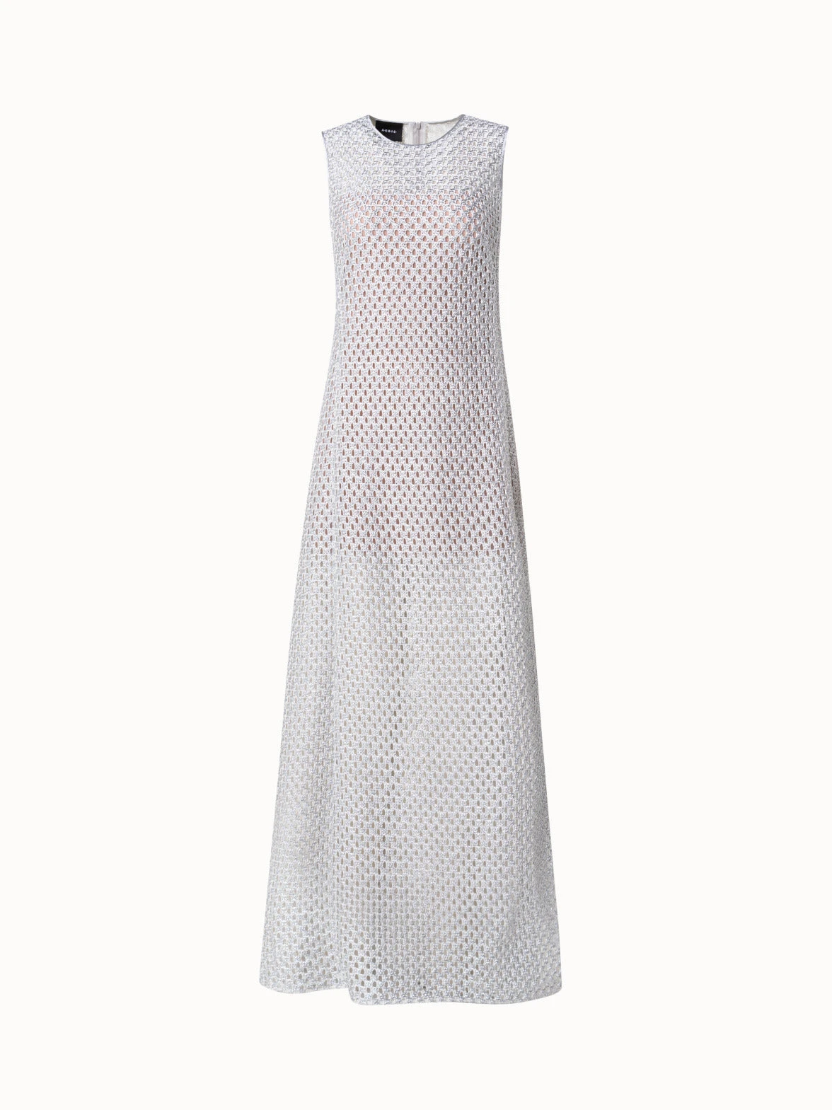 gown, lurex cotton metallic crochet embroidery, round neck, side slits, sleeveless