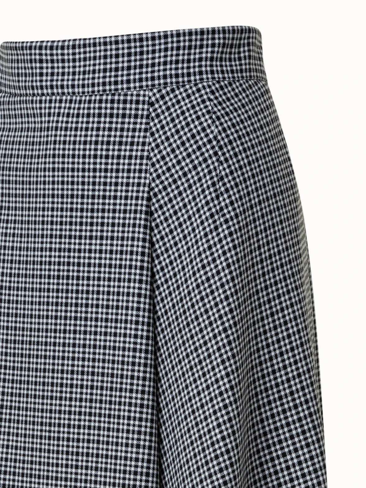 This Akris midi skirt is crafted in wool with a microcheck pattern. The asymmetrical godet cut creates a modern silhouette and flowing movement. Closes with a back zip.