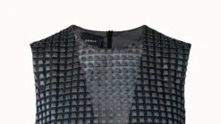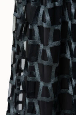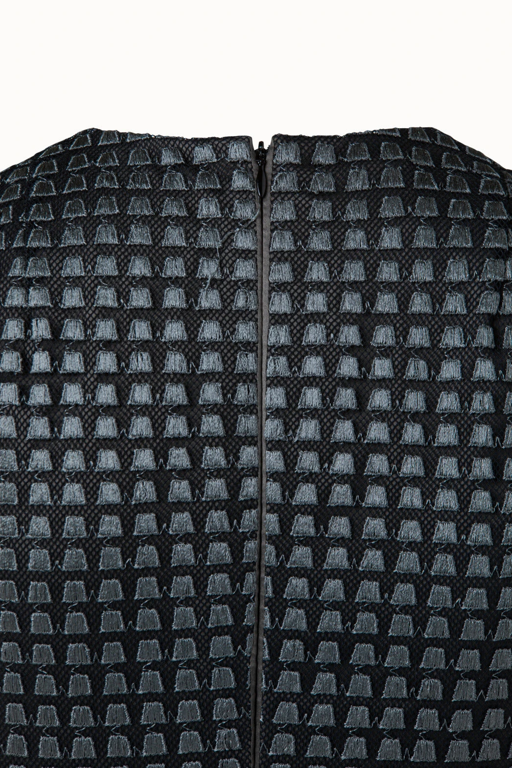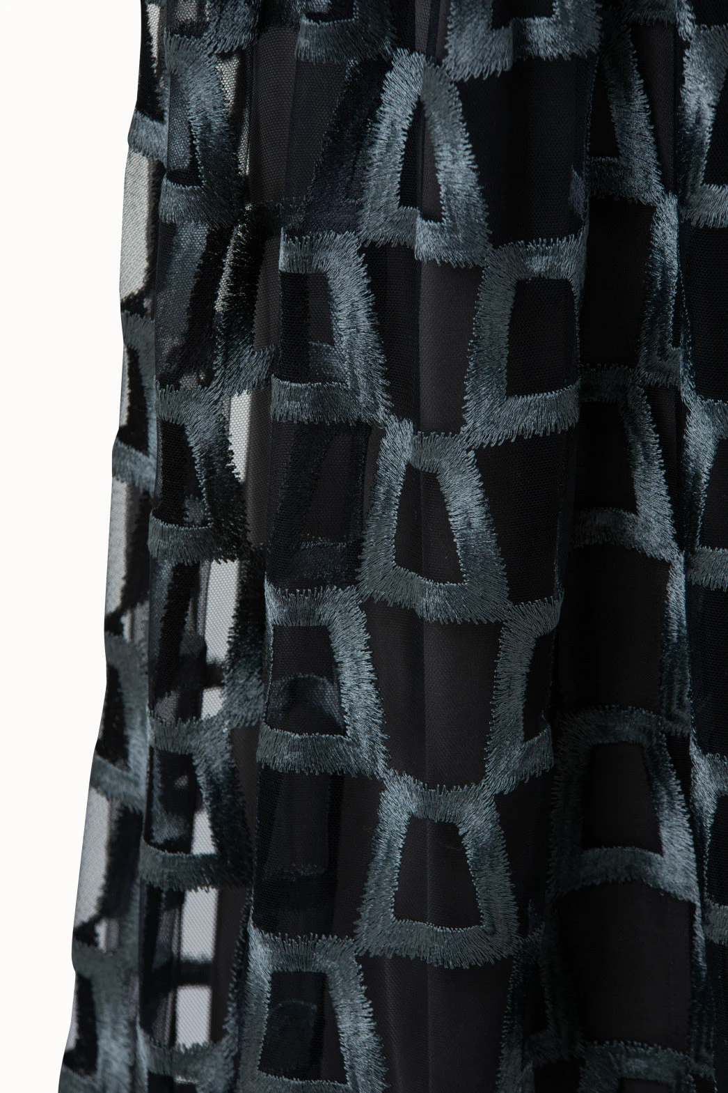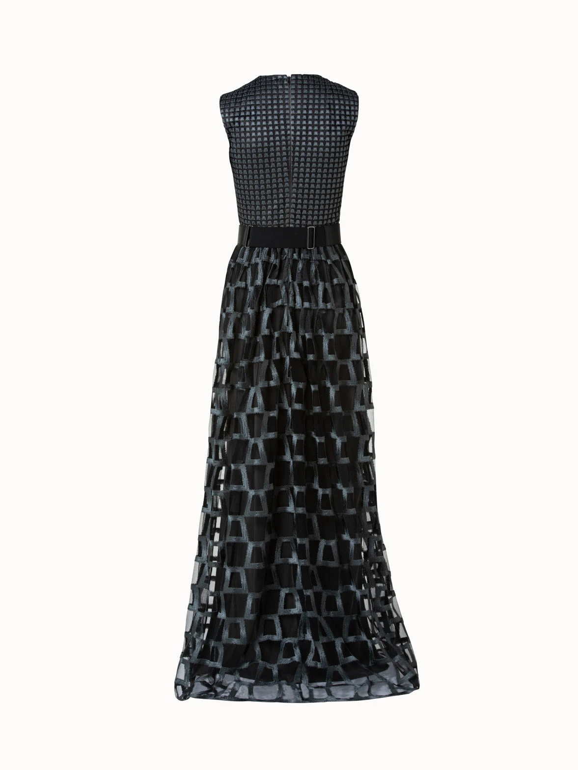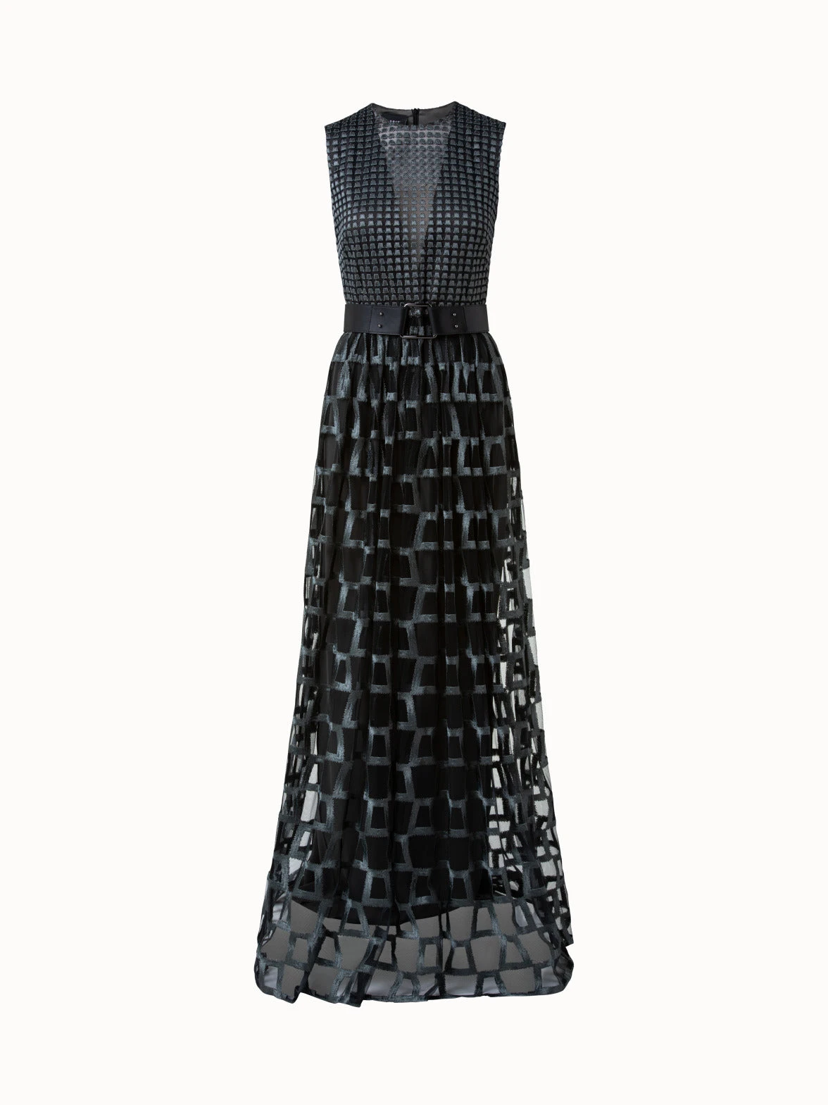 A statement-making gown that encompasses Akris’ commitment to exceptional fabrics and craftsmanship. The trapezoid grid embroidery top with tulle v-neck inset harmoniously complements the the mirrored trapezoid embroidery skirt. Designed with a round neck, back zip closure and including a wide leather statement belt with trapezoid buckle to complete the look.