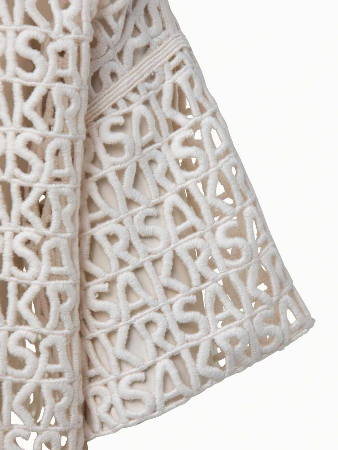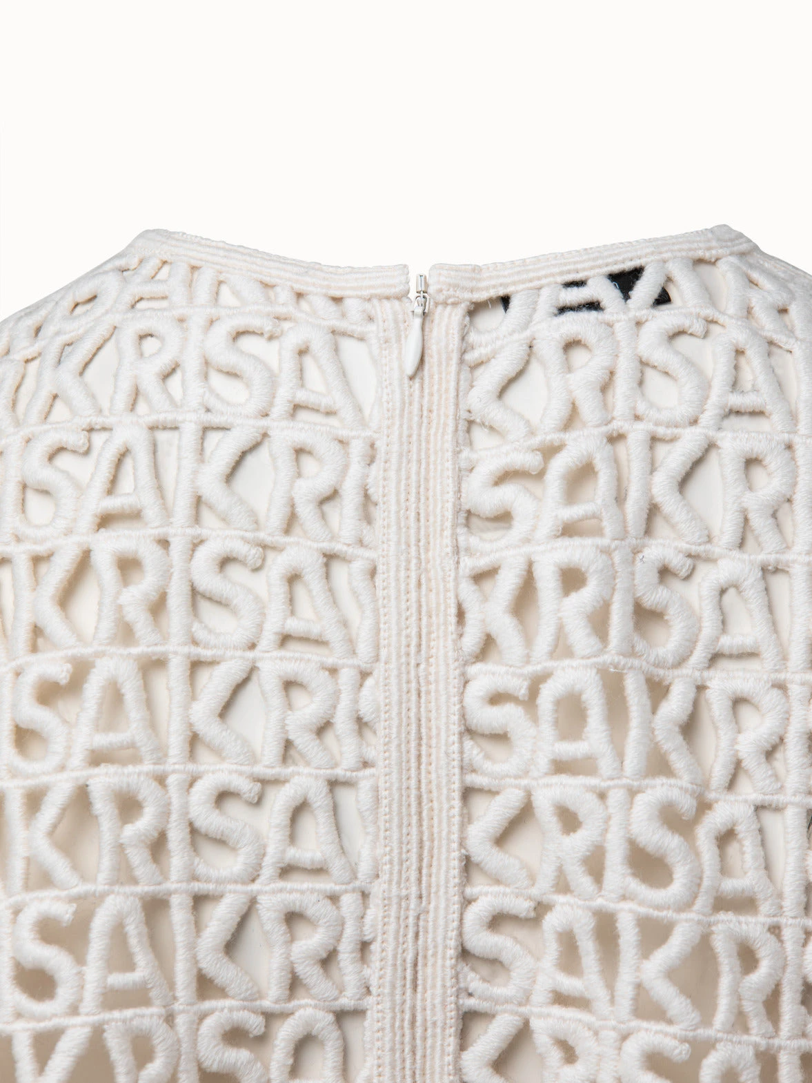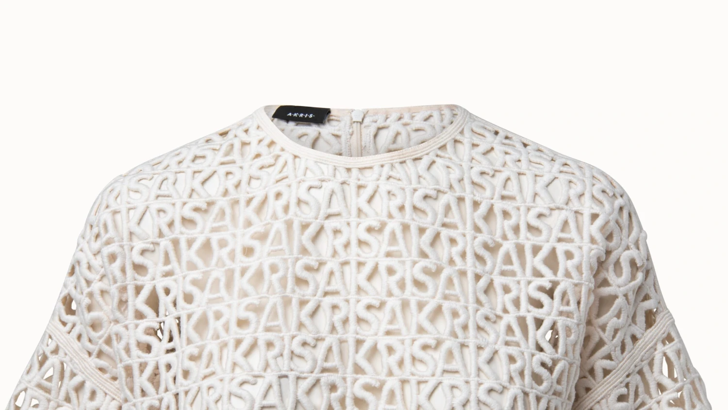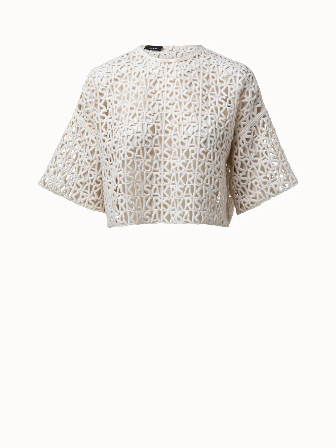 This fashion forward cropped blouse is artfully crafted in wool Akris infinite embroidery. Designed with a round neck, back zip closure, and short sleeves, this boxy shaped blouse is easy to wear when layered over a white tee or our long sleeve mock neck tops in cashmere and silk.