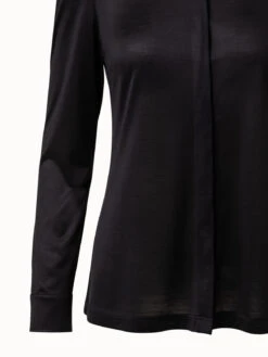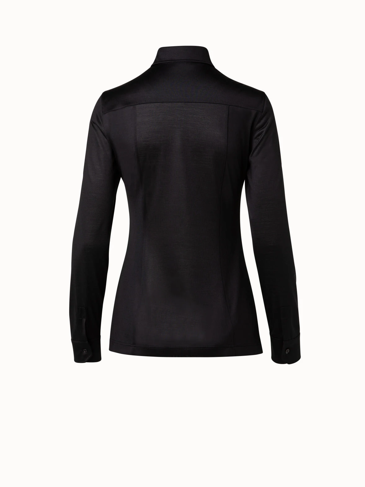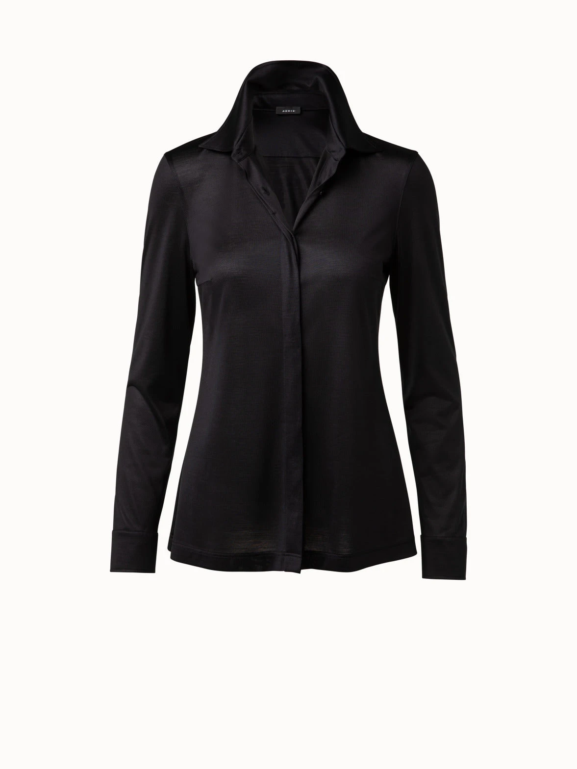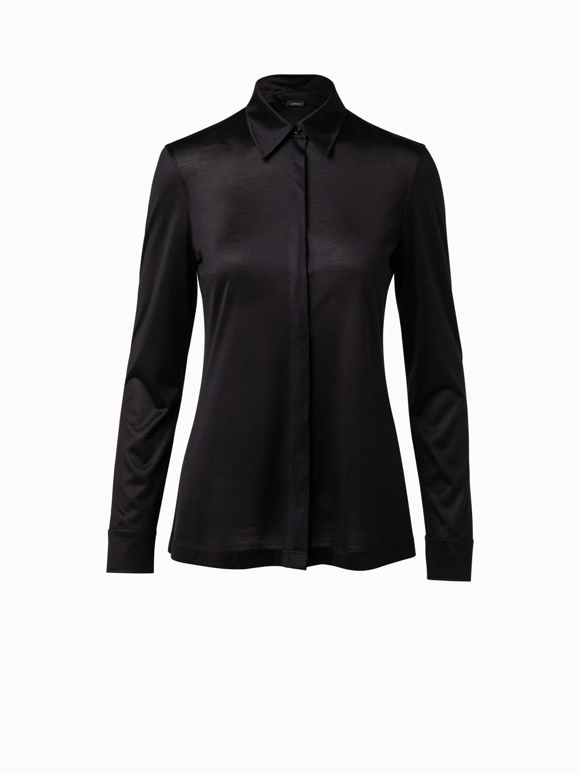 This Akris blouse is a new elegant essential. Crafted in silk jersey, it is highly comfortably yet sophisticated at the same time, making it ideal for both daily wear and formal occasions. It features covered buttons for a streamlined look and is cut for a fitted silhouette with a shirt collar and long sleeves.