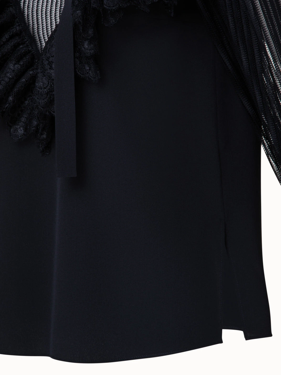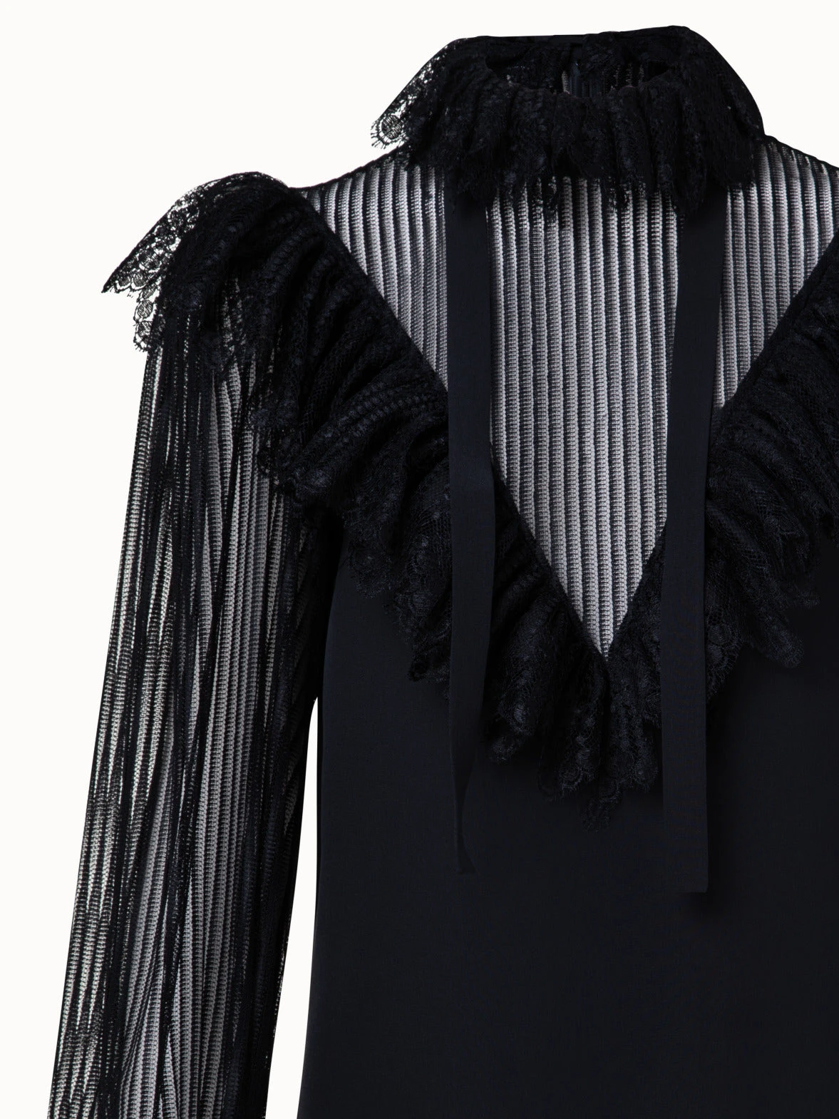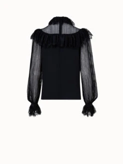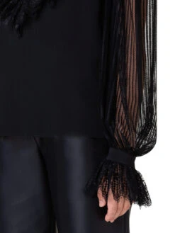 “This blouse is a recreation of a vintage Akris design from the 1980s. It is crafted in silk crêpe and two types of lace. Stipes create a sensual look around the neckline, shoulders, and sleeves, while the ruffled lace adds to the vintage appeal. The tie- ribbon allows for personal styling options. Closes with a back zip.