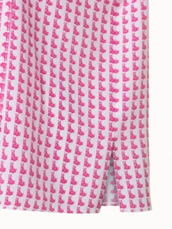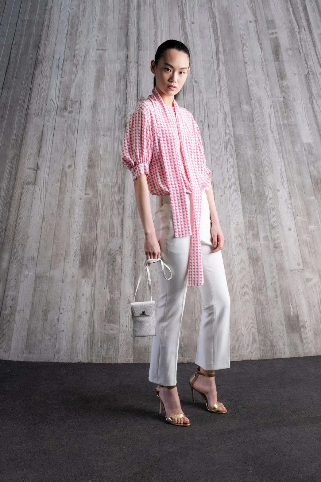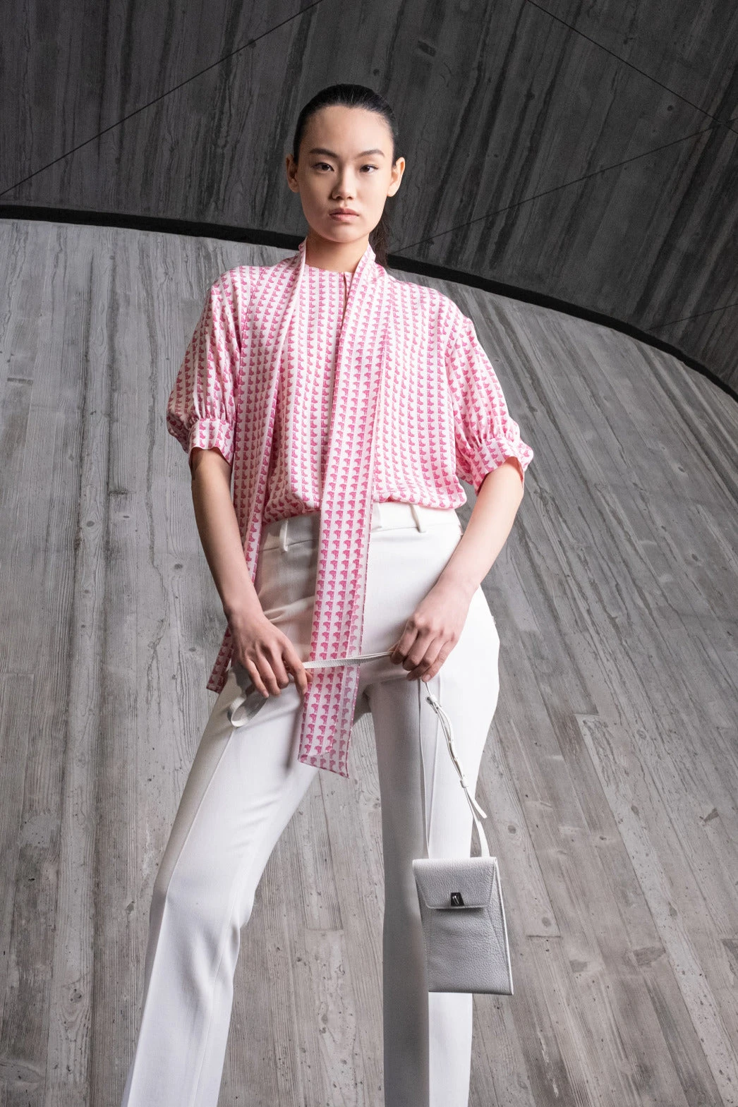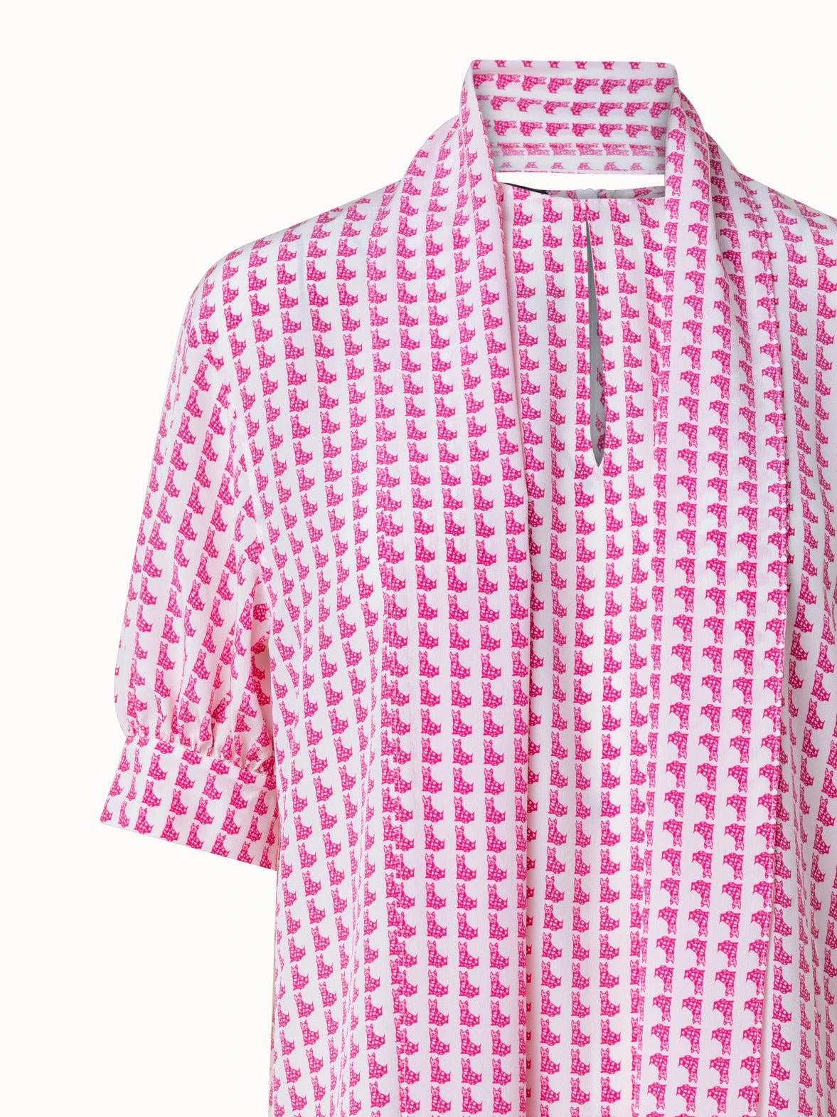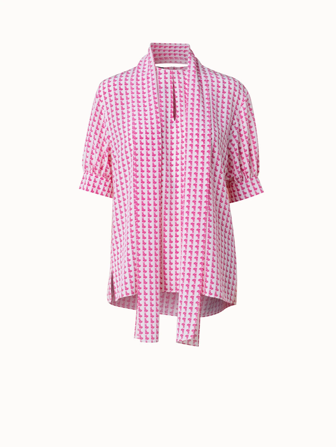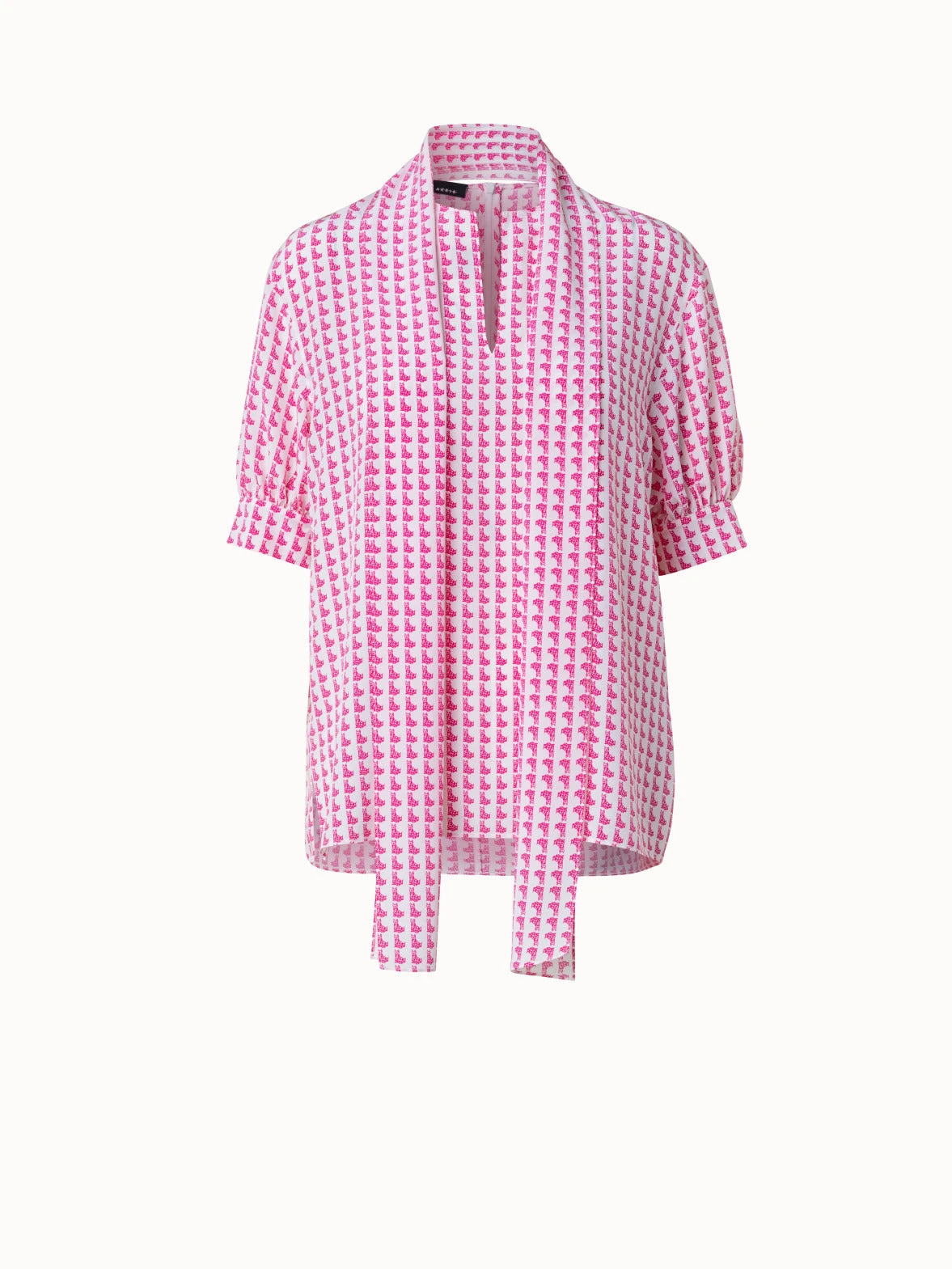 This Akris tunic blouse is crafted in silk crêpe with Emma print. The all-over Emma motif is a playful, witty reminiscence of a 1970s design by Max Kriemler and renamed after creative director Albert Kriemler’s dog. The blouse features a round neck with front slit hook closure. The dropped shoulders and volume elbow-length sleeves create a modern silhouette. The detachable bow allows for versatile styling.