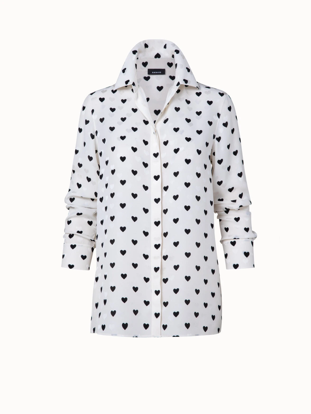 This Akris tunic blouse is crafted in silk crêpe with hearts print and jacquard. The shirt collar and covered button placket create a sleek and sophisticated look. The back pleat and side slits add an airy feel, making it perfect for spring and summer.