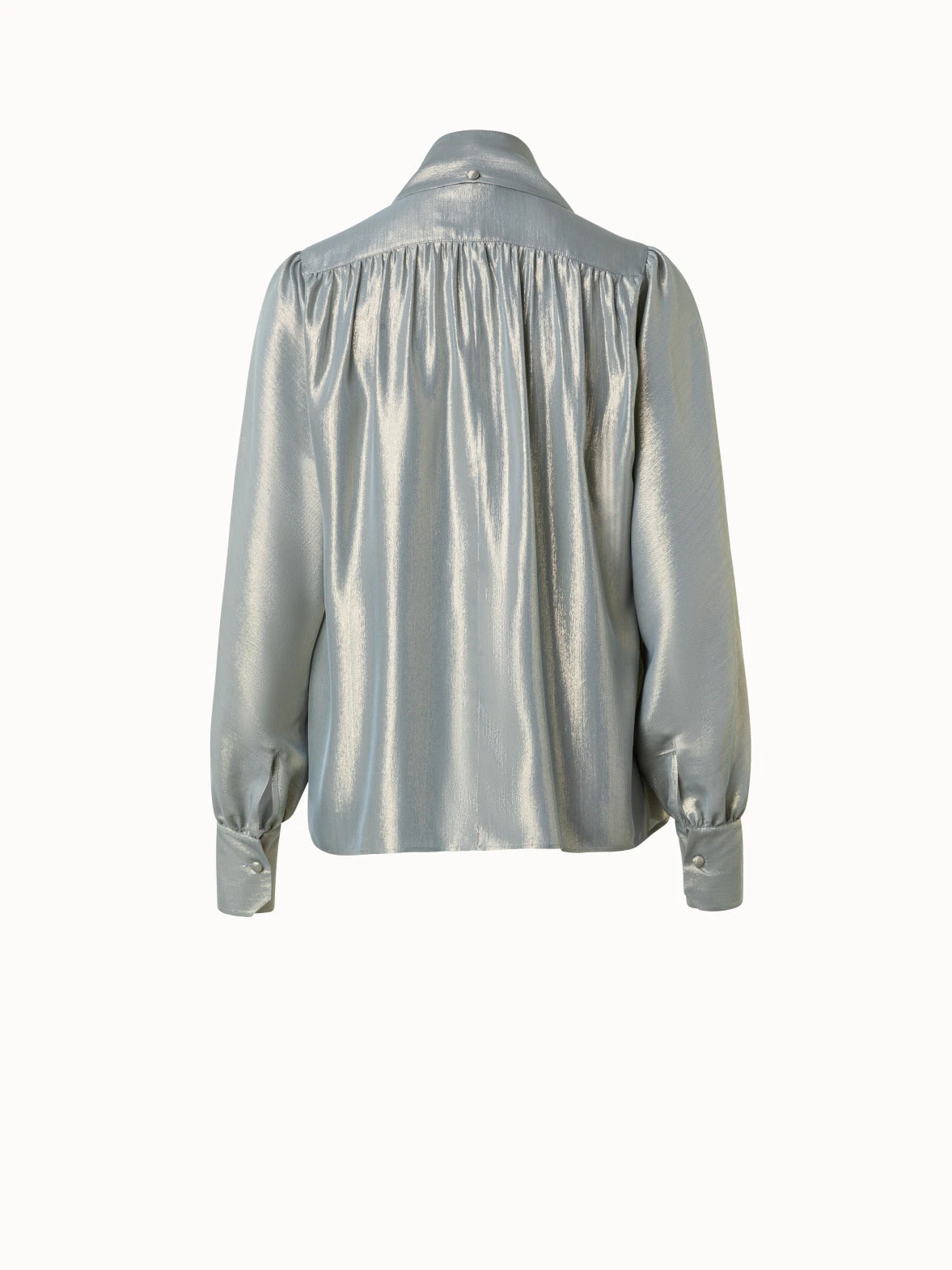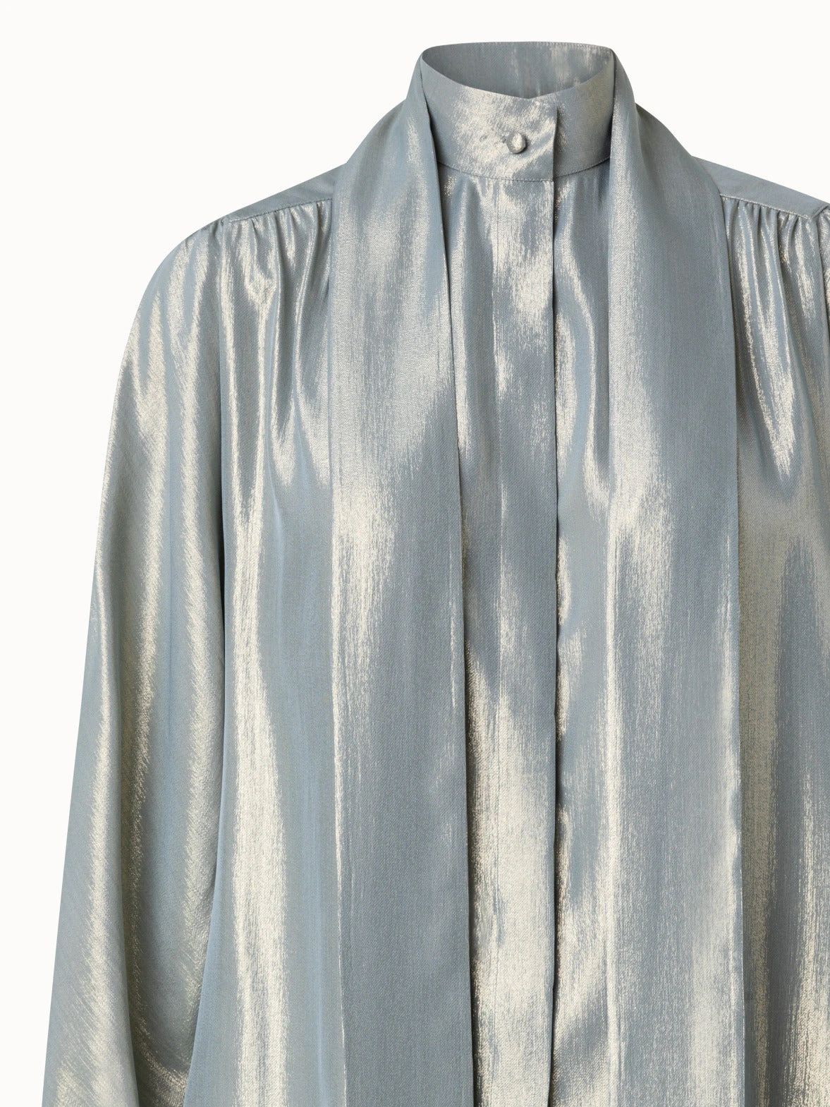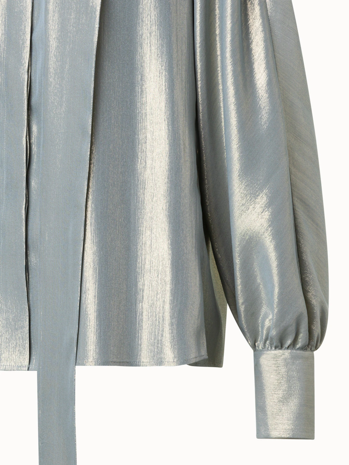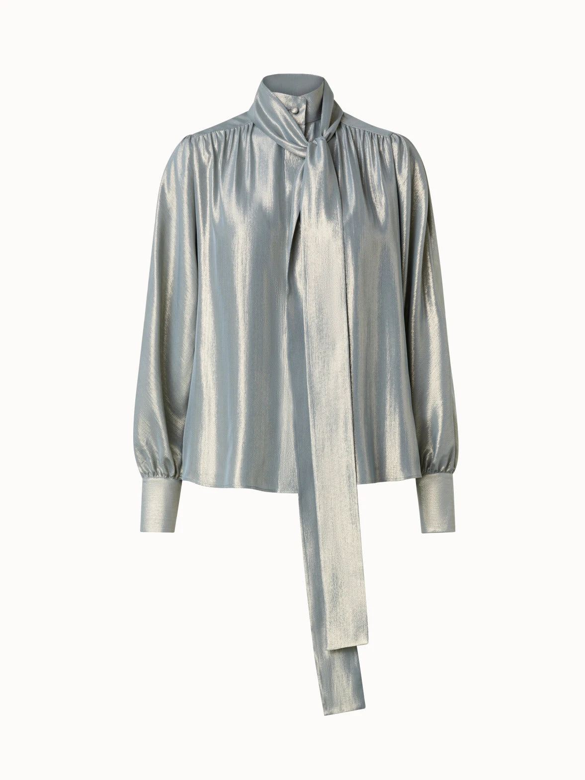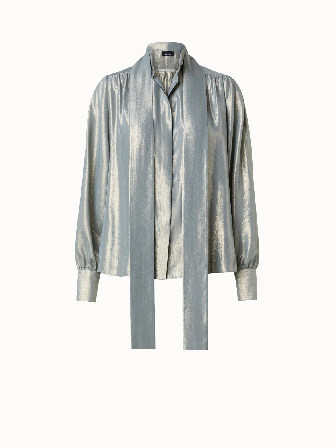 This Akris blouse is an elegantly flowing design made to stand out. The silk lurex organza fabric, oversized cut, pleated shoulders, and necktie all add to its shimmering movement.