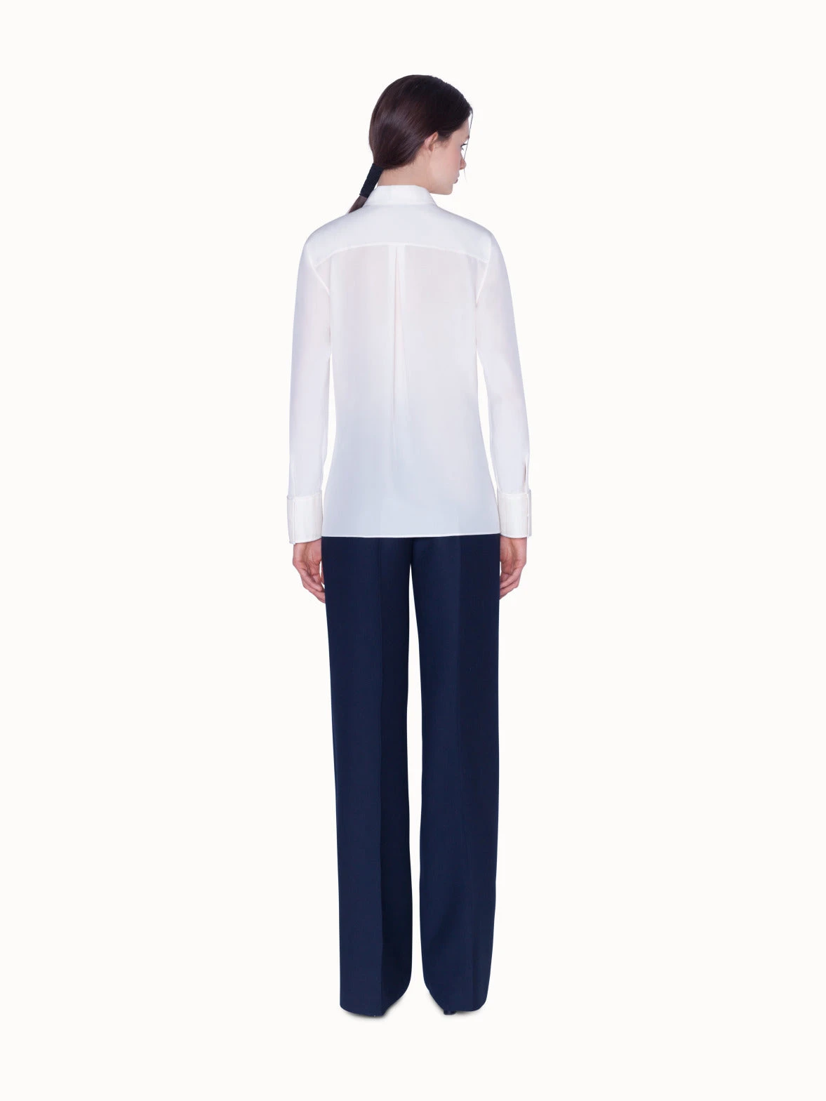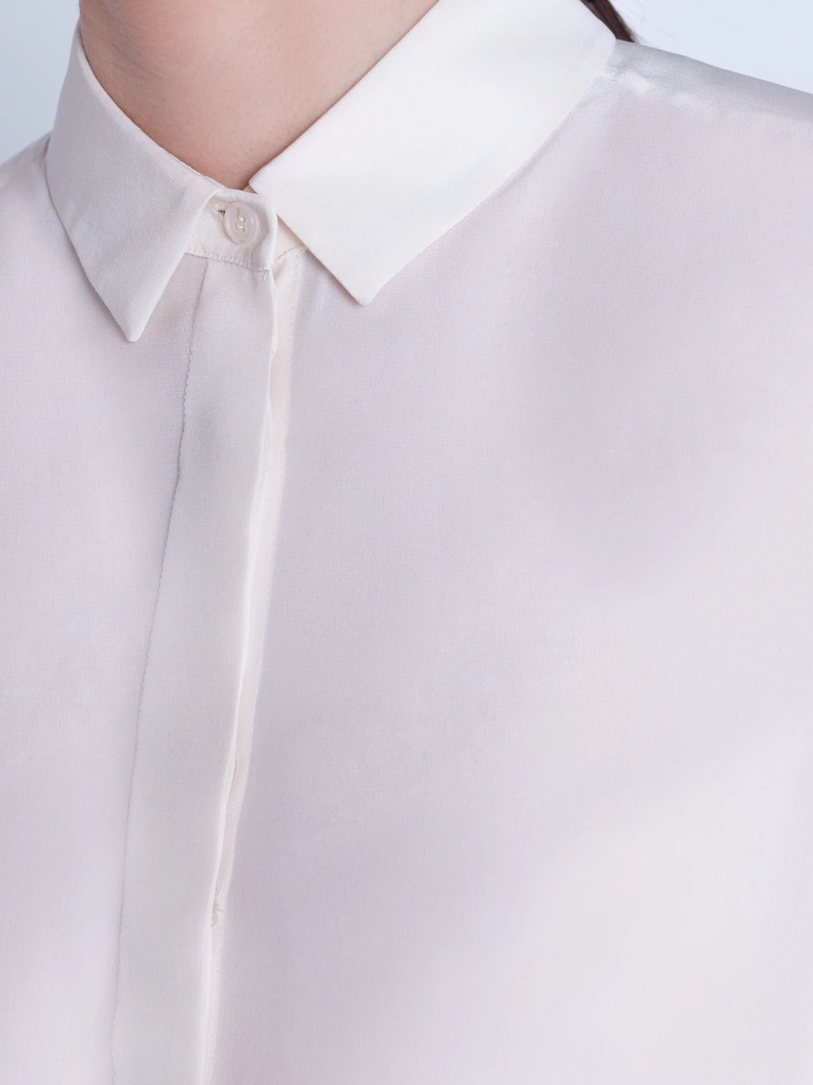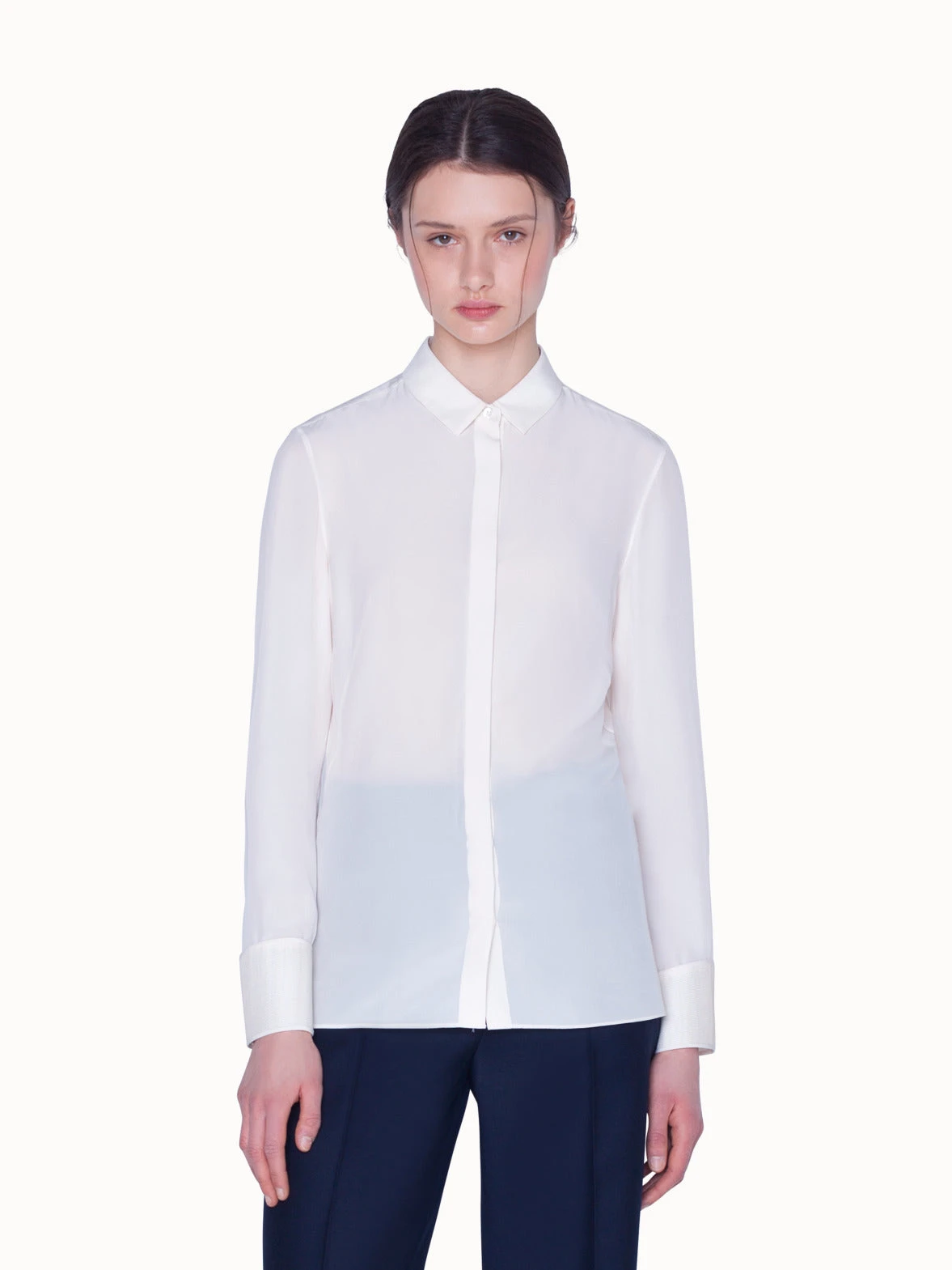 Blouse in silk satin, featuring a shirt collar, covered button panel and original horsehair cuffs