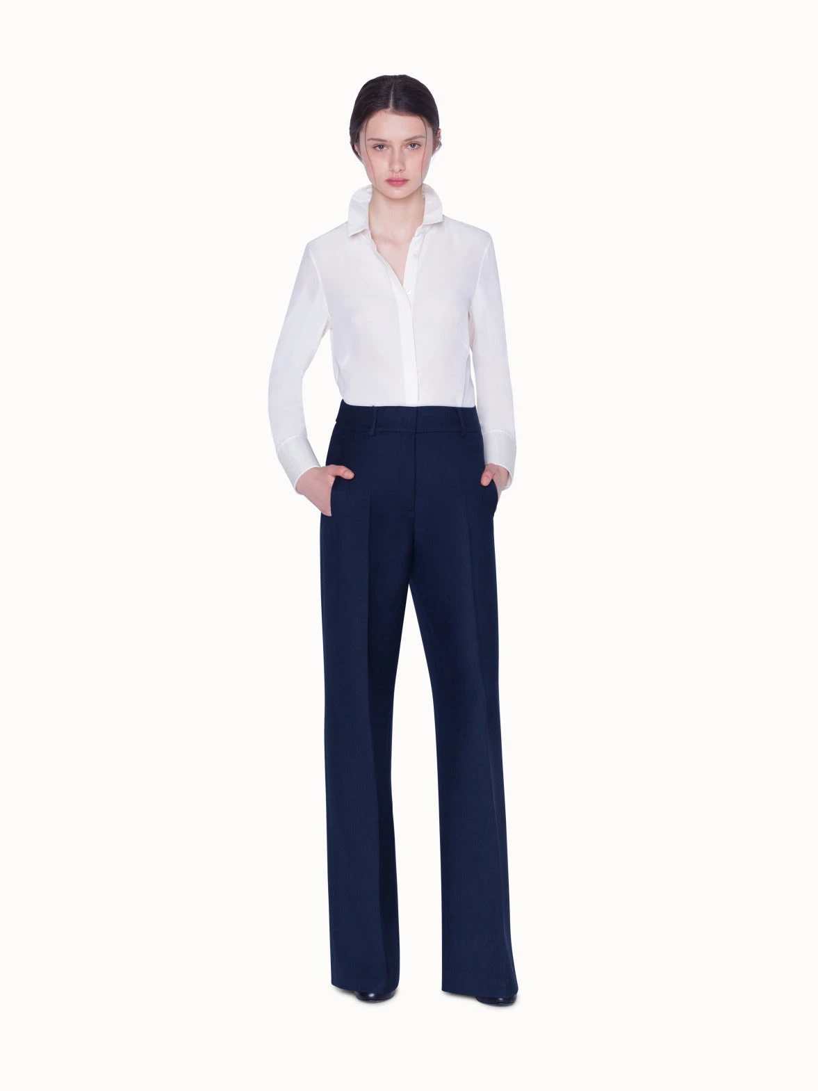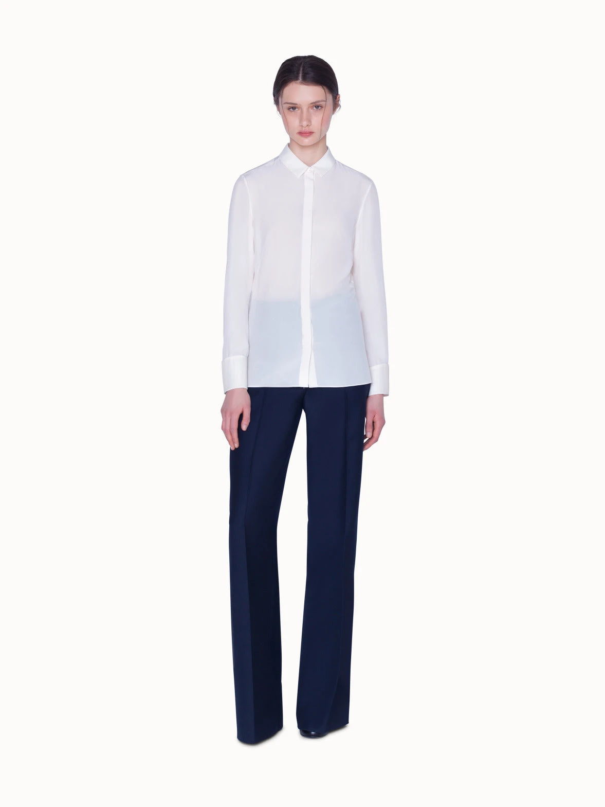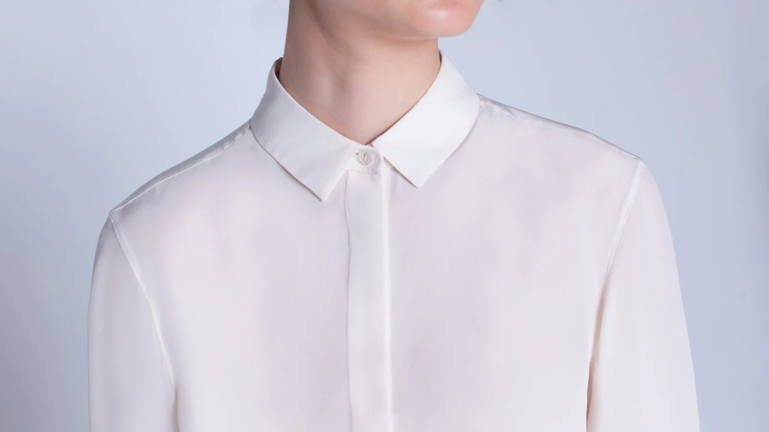 Blouse in silk satin, featuring a shirt collar, covered button panel and original horsehair cuffs