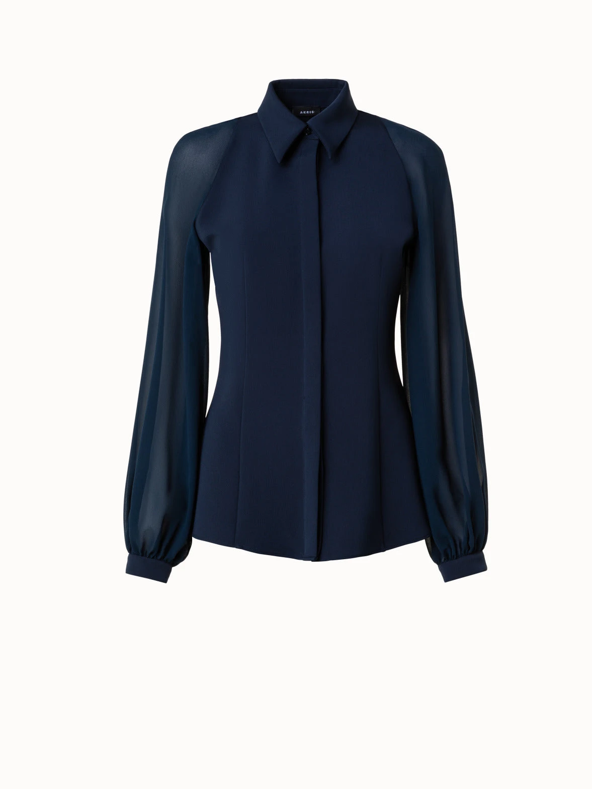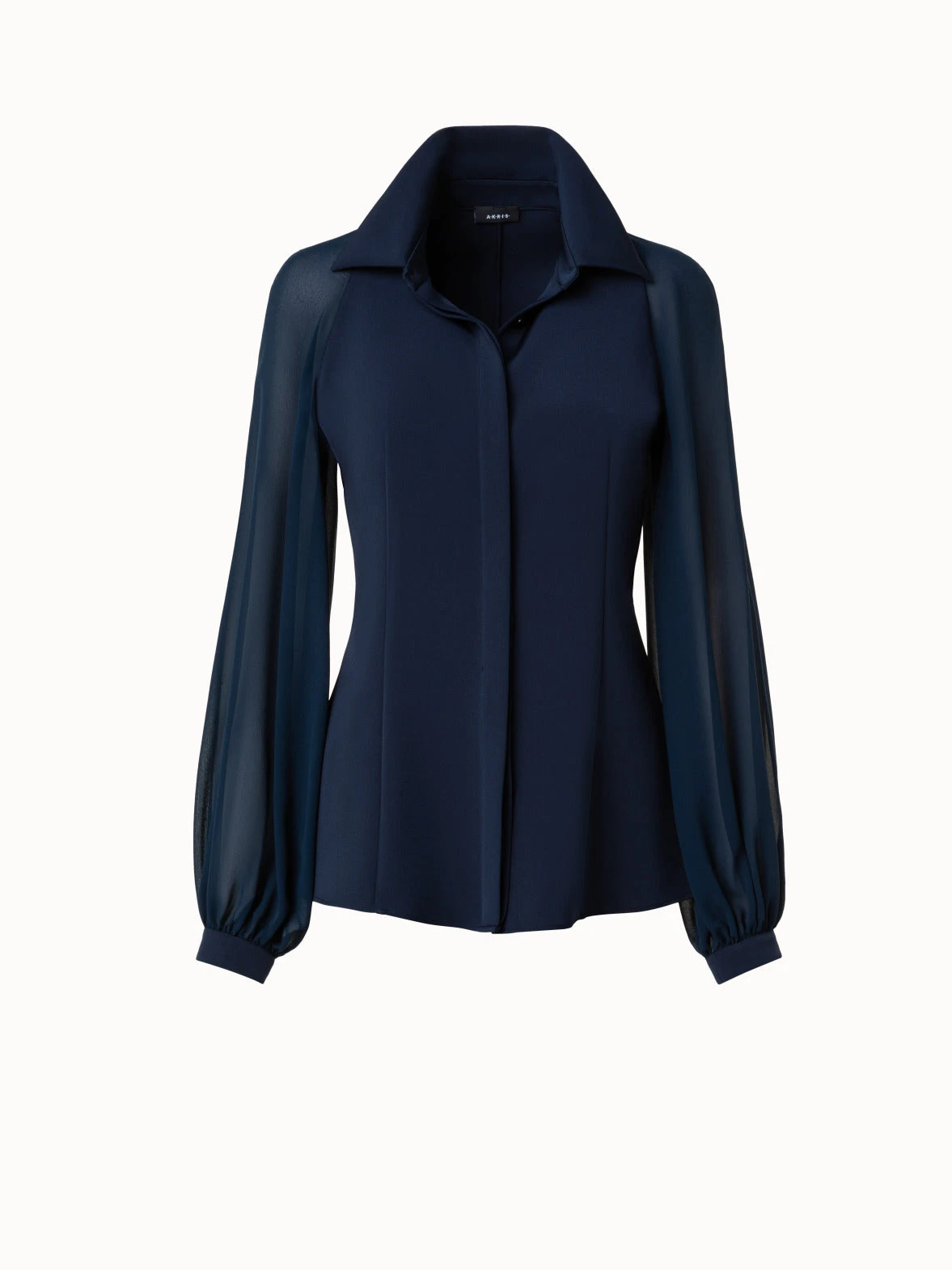 This Akris blouse combines a fitted bodice in silk crêpe with lightweight, transparent organza volume sleeves for an elegant, feminine silhouette.