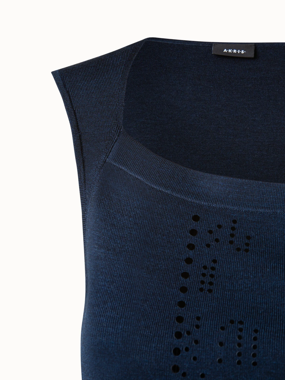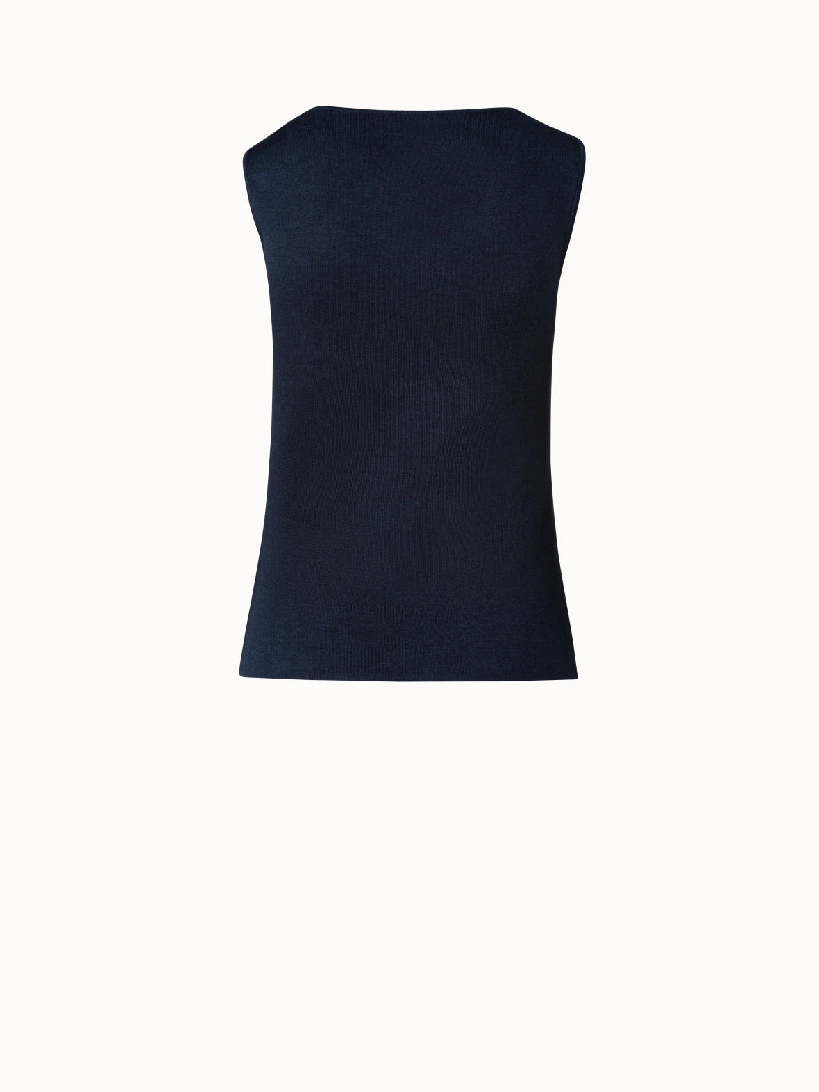 This elegant top is knitted in a fine silk stretch and features an iridescent punchcard application down the front. Designed with a trapezoid neckline, this sleeveless, fitted silhouette is gorgeous under an evening blazer or worn on its own tucked into a skirt or high-waisted pant.