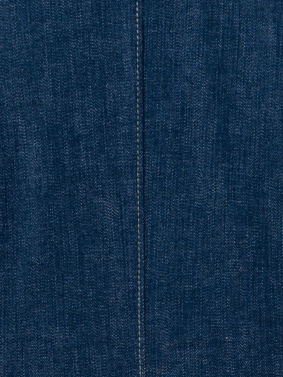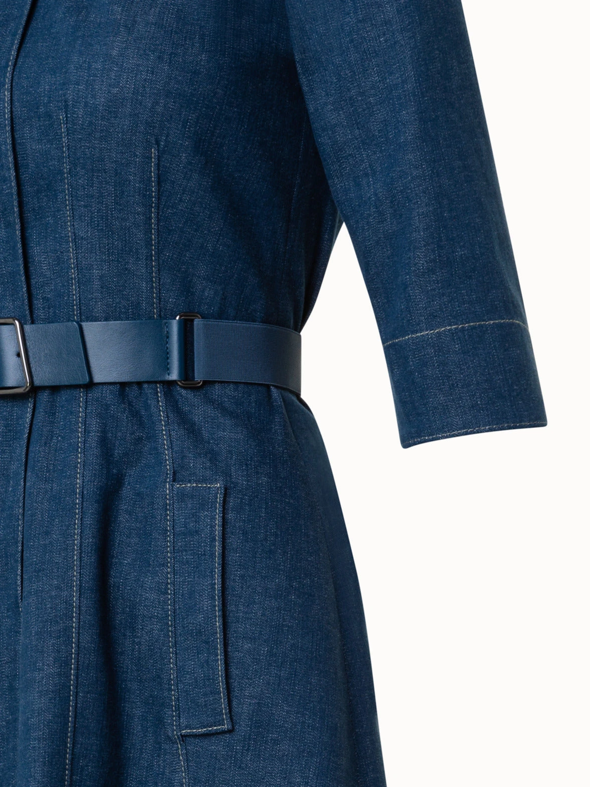This Akris midi dress is crafted in comfortable cotton stretch denim, giving the shirt dress a casual appeal. In classic denim fashion, it features contrast stitching. The shirt collar, button closure, and elbow-length sleeves make it a versatile style for many occasions. The included belt accentuates the flattering A-line silhouette.
