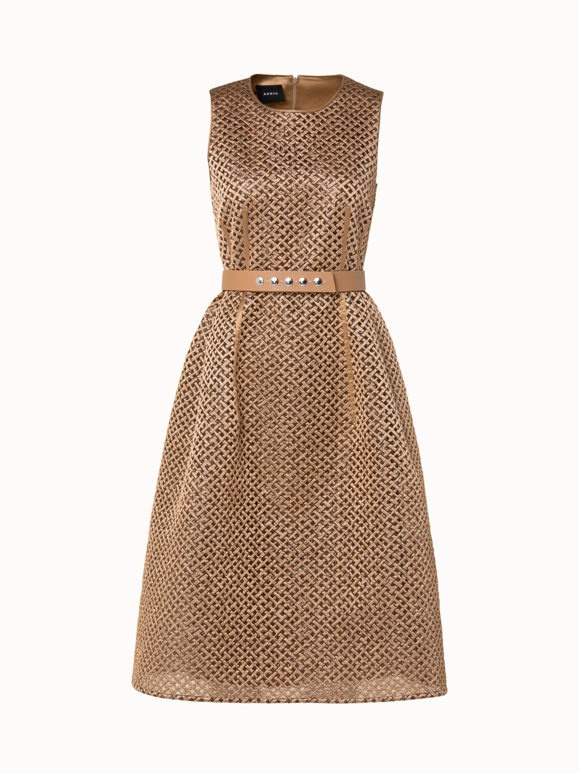 This structured cocktail dress is made from a techno embroidery on transparent foil, exhibiting Akris’ incredible craftsmanship. Designed with a round neck, full, a-line skirt and pockets. Includes a gold leather belt featuring metal snap details.