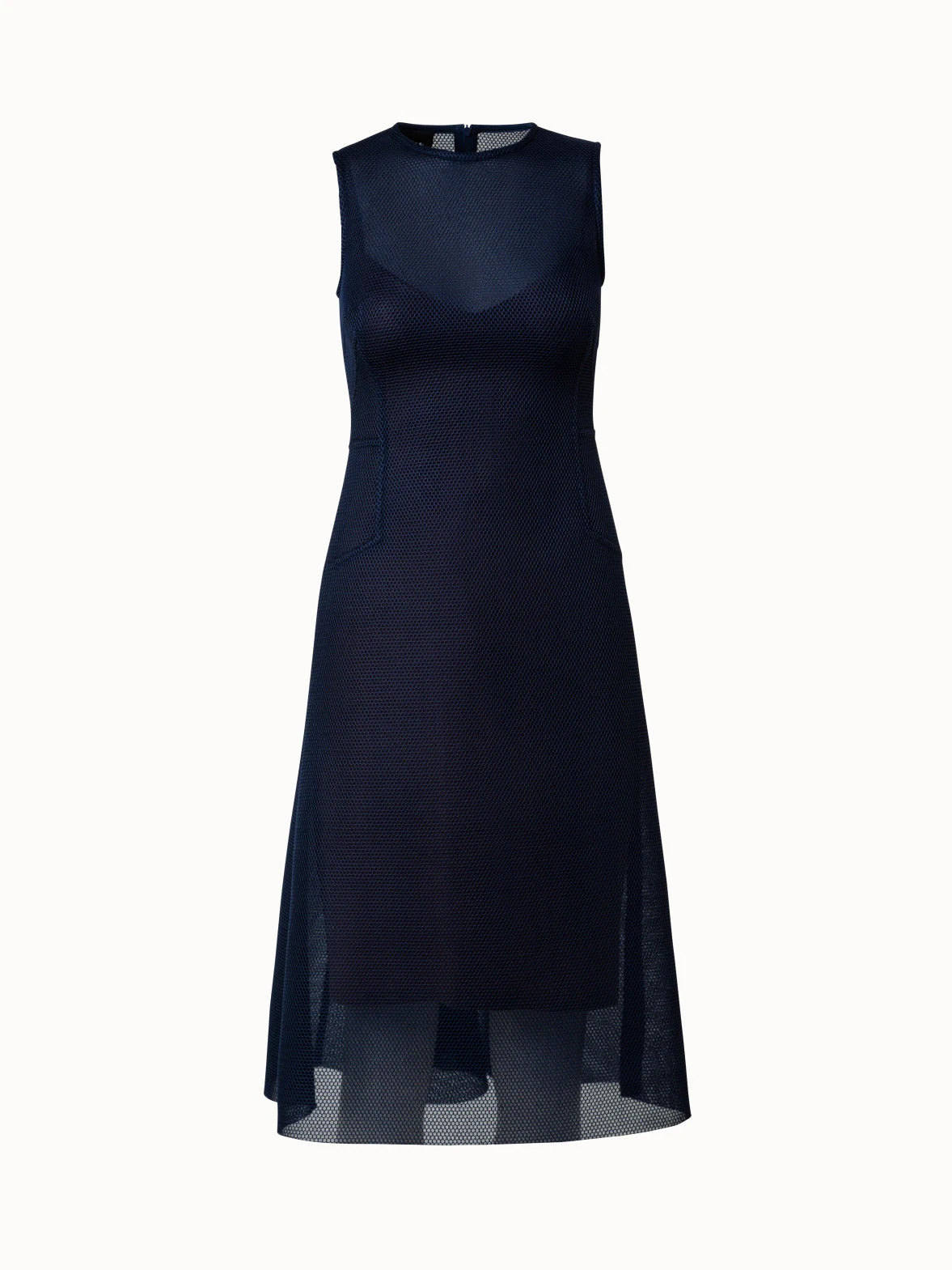 This Akris midi dress is crafted in a modern techno grid fabric that creates a structured look and comfortably lightweight feeling. It features a round neck and zip closure. The fitted body and skirt with back godet create a flattering silhouette. Includes a slip dress.