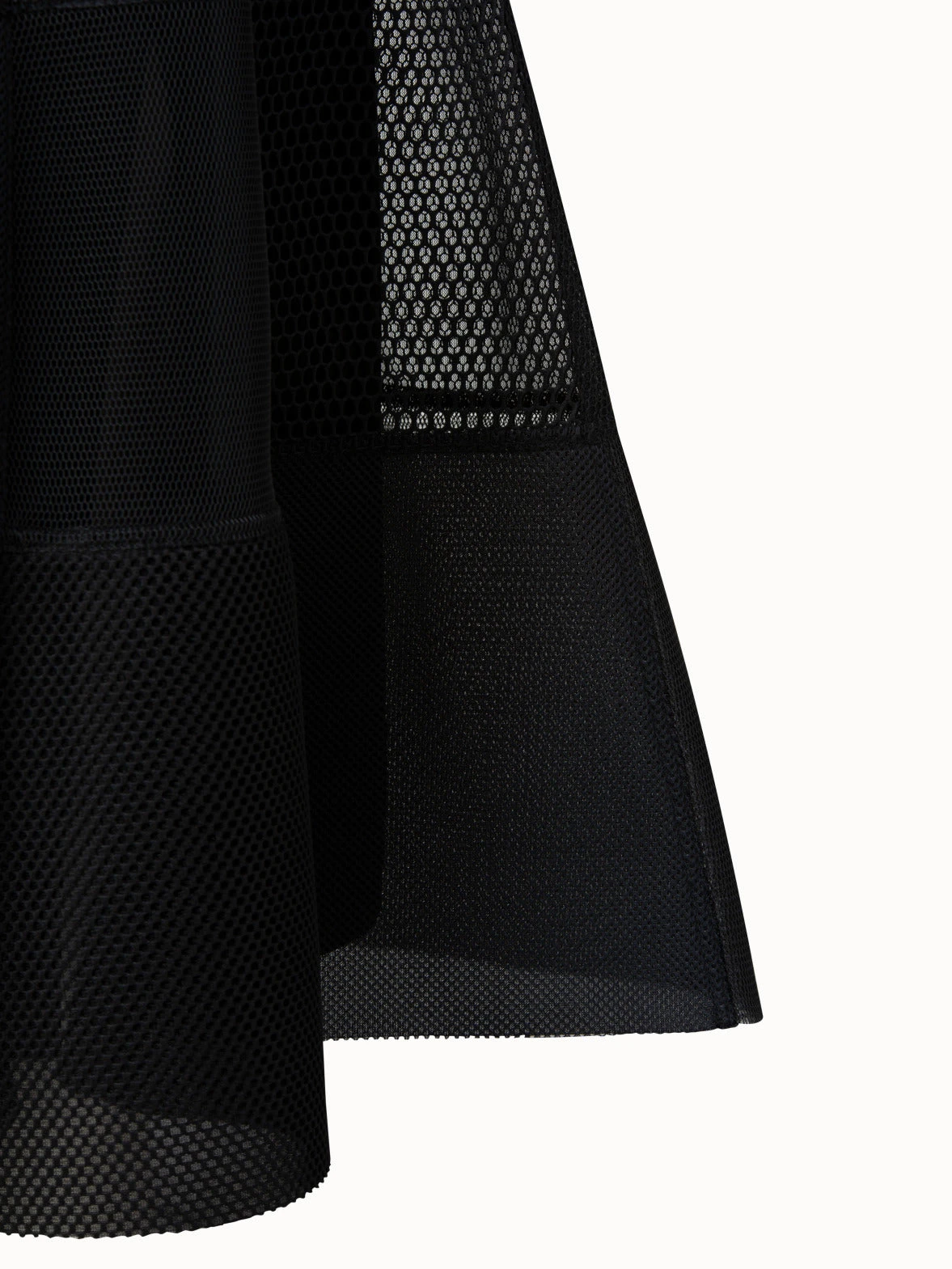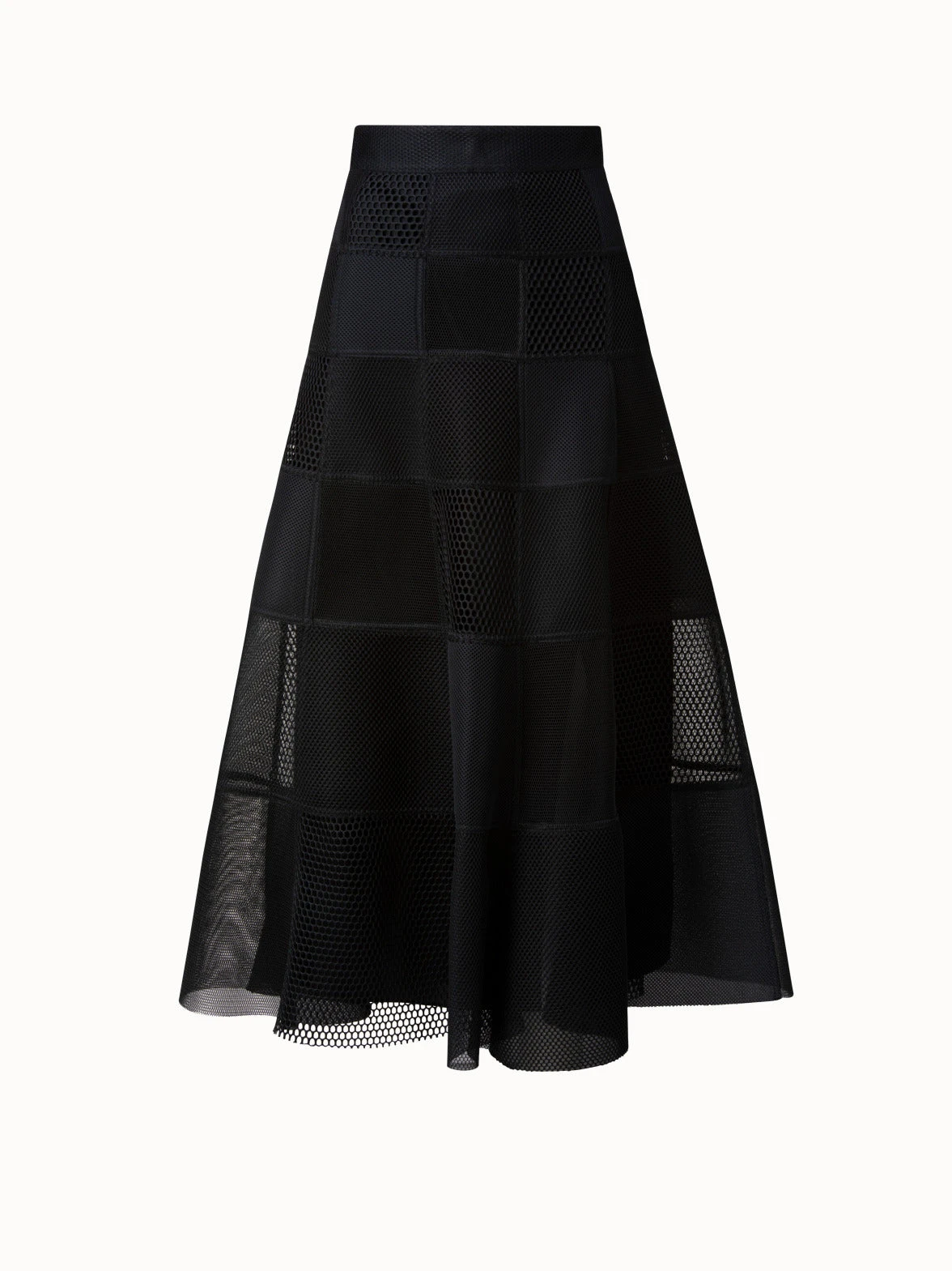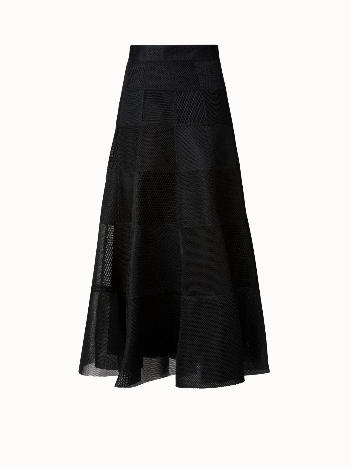 This Akris long skirt is crafted in techno grid patchwork. Patches of grids with different densities create a subtle monochrome checkered look. The skirt is cut for an A-Line shape and closes with a hidden zip.