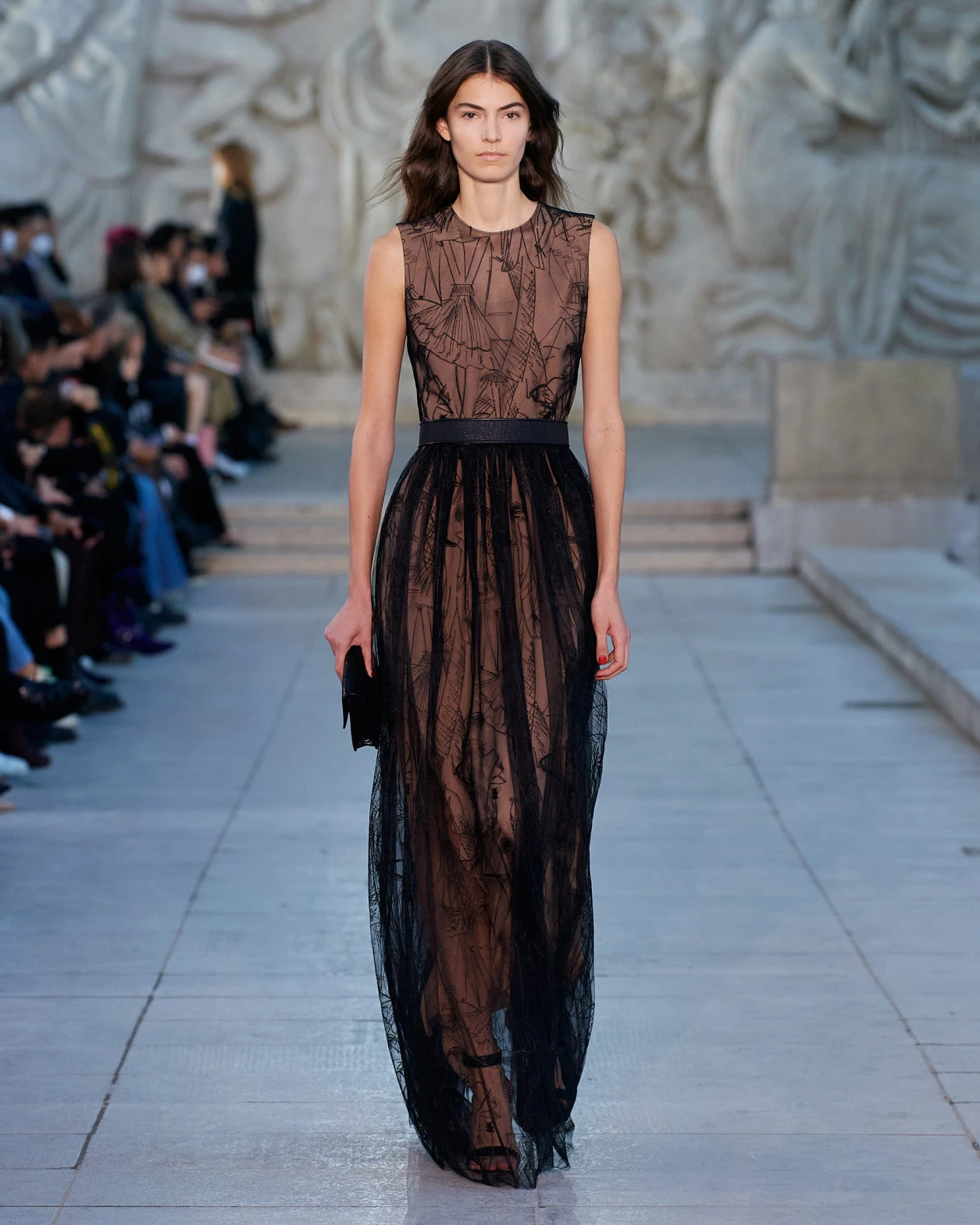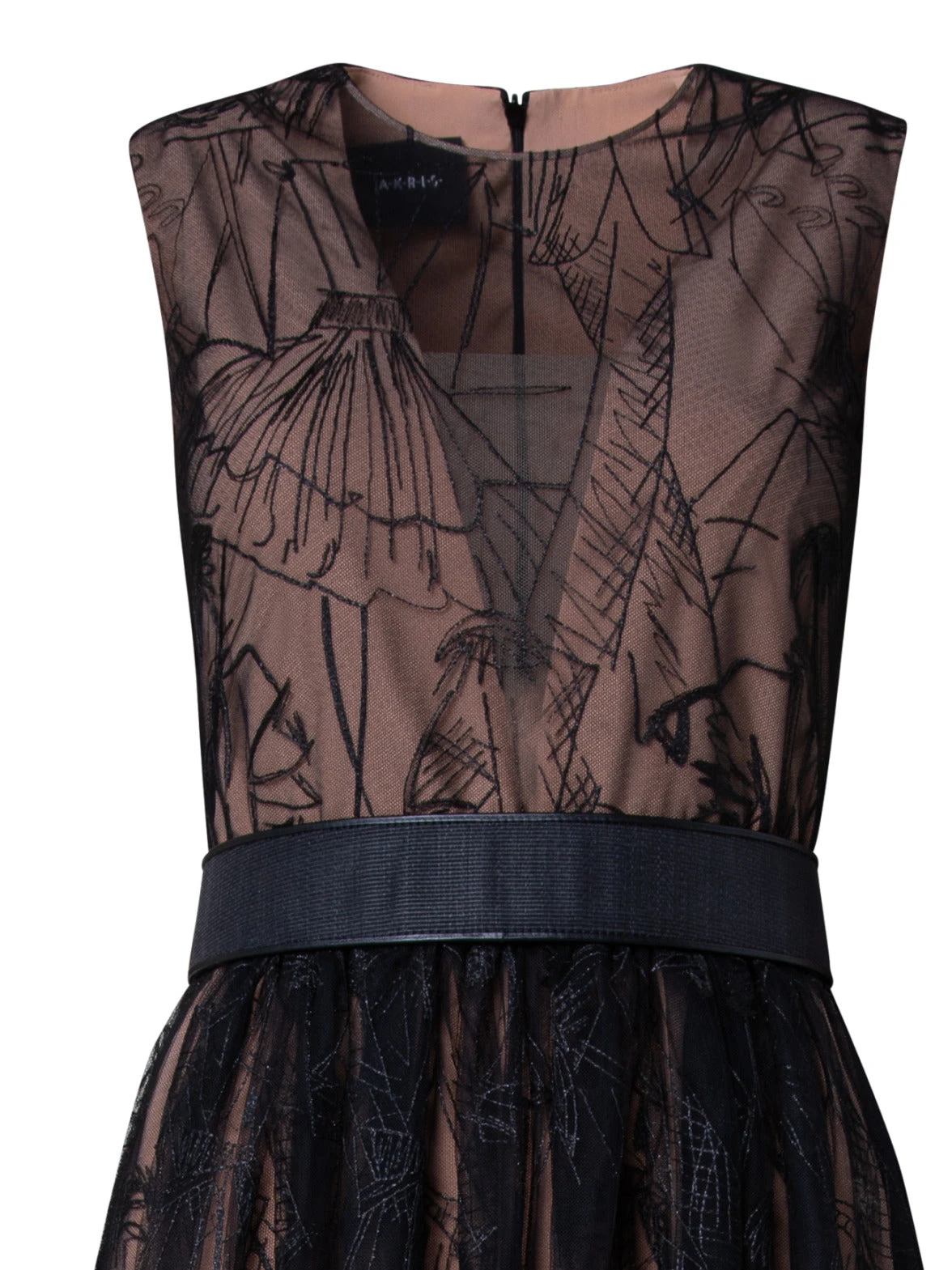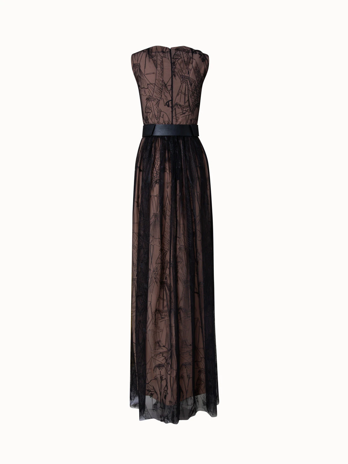 This Akris gown is crafted in techno tulle with Croquis embroidery. The fitted sleeveless top and flared skirt create a flattering and elegant silhouette. The signature horsehair belt accentuates the waist.