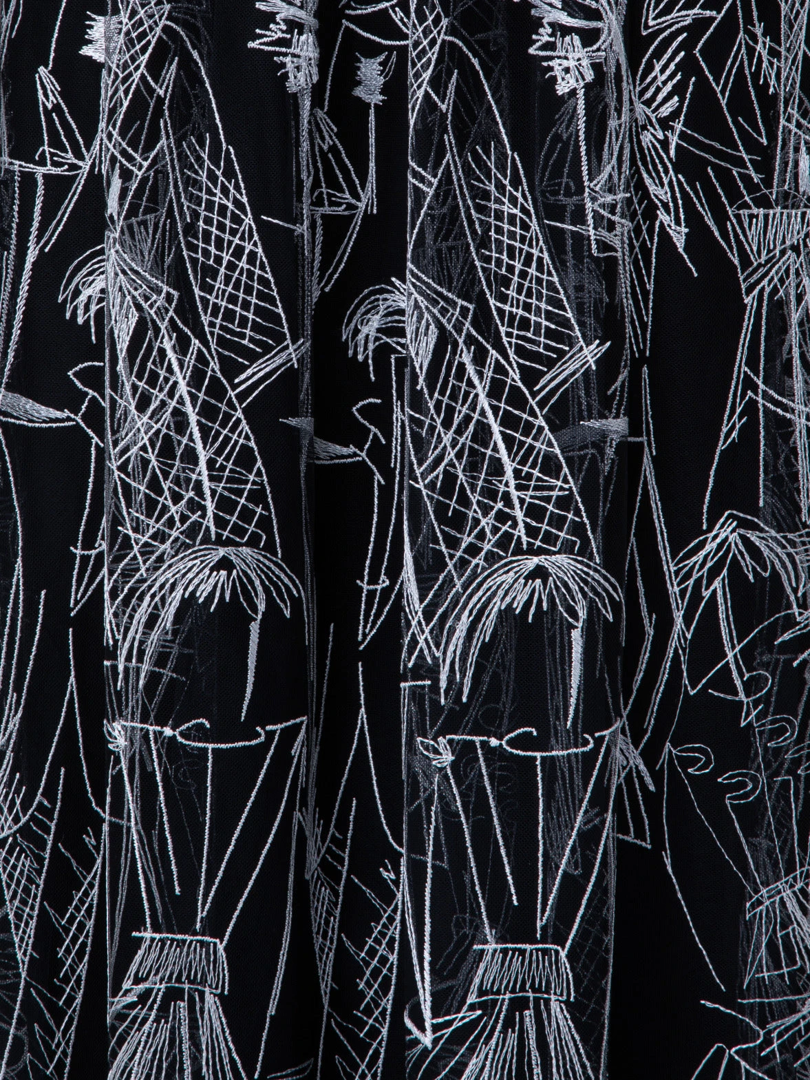 Displaying sketches by creative director Albert Kriemler, the Croquis embroidery of Akris Spring 2023, shown on this skirt, tells a very personal story. Witty and charming, it was designed by his team as an anniversary surprise.