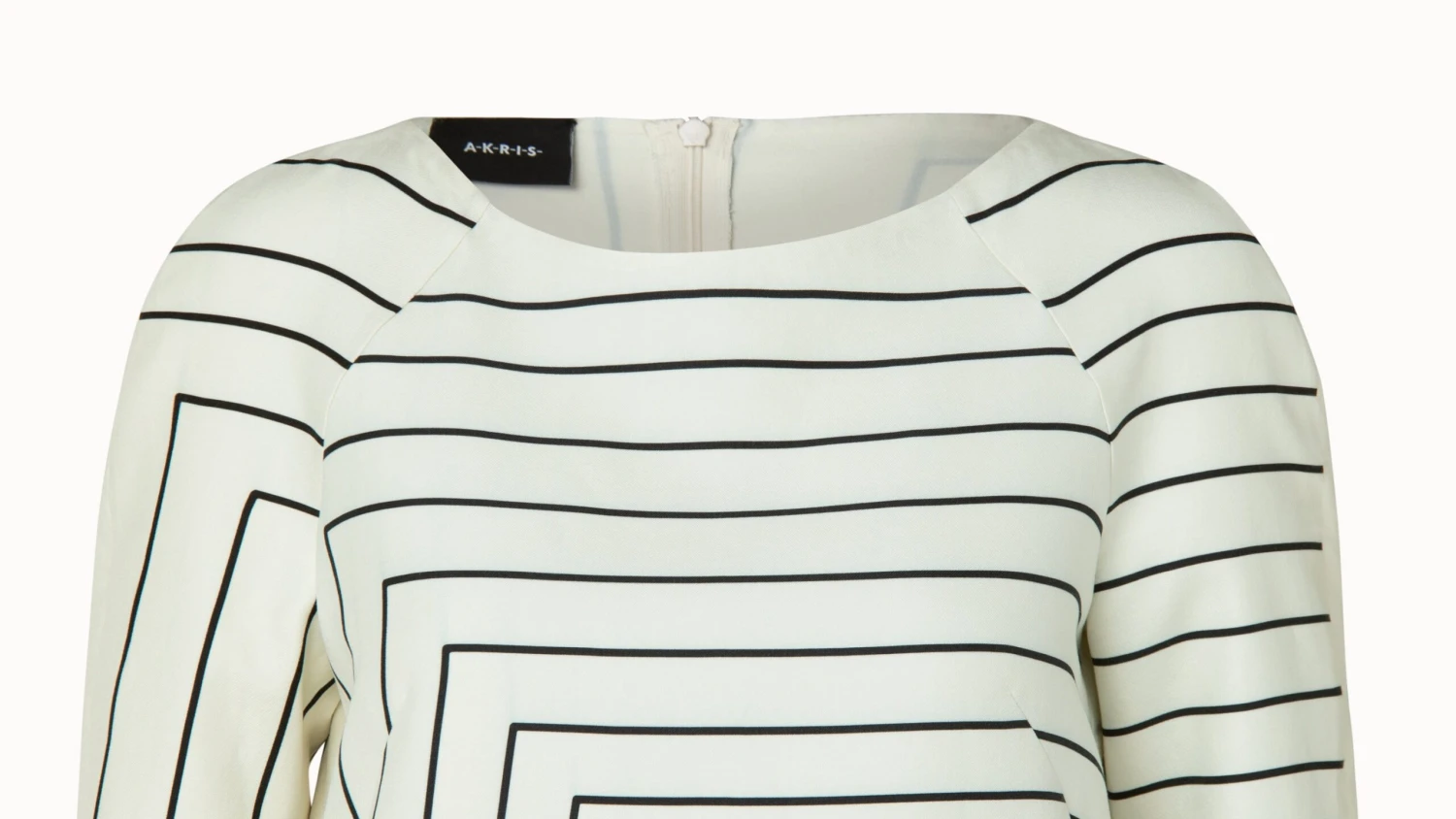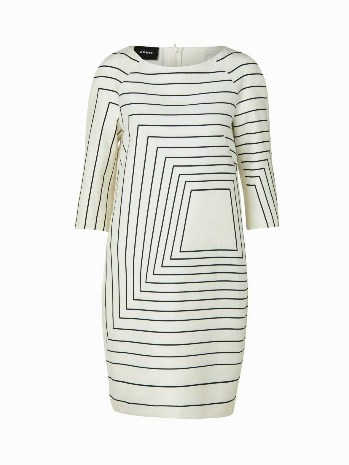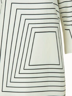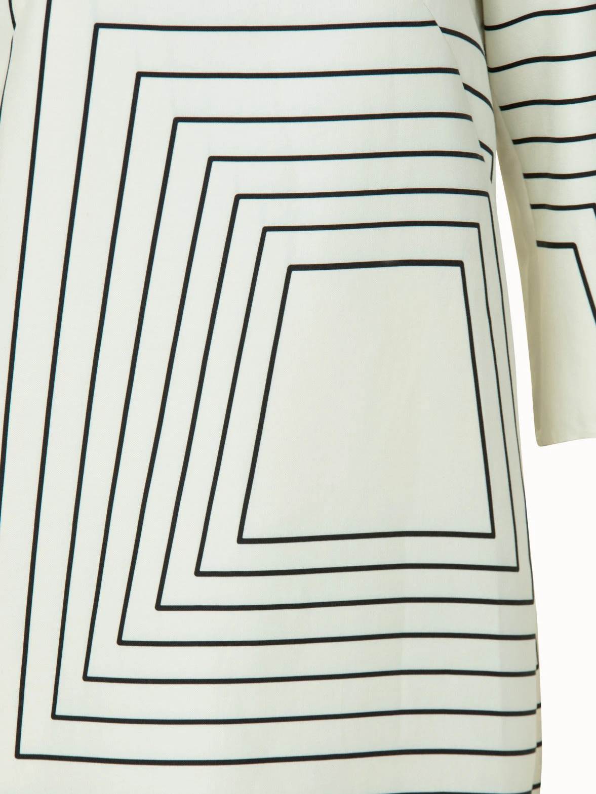This monochrome cotton silk double-face Trapezoid Square Print dress highlights the elegance of the print whilst the egg shape is accentuated by a boat neck and bracelet length sleeves for a feminine look. This is a versatile dress for an all year-round edit. The contrast continues at the back that is kept in écru.