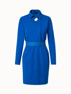This Akris dress is crafted in viscose wool jersey. It features a shirt collar with a large golden button that is inspired by details from Akris collections of the 1980s. The collar can be opened to create a deep v-neck with lapels. The skirt features front pleats. The included signature horsehair belt accentuates the waist and adds a luxurious detail.