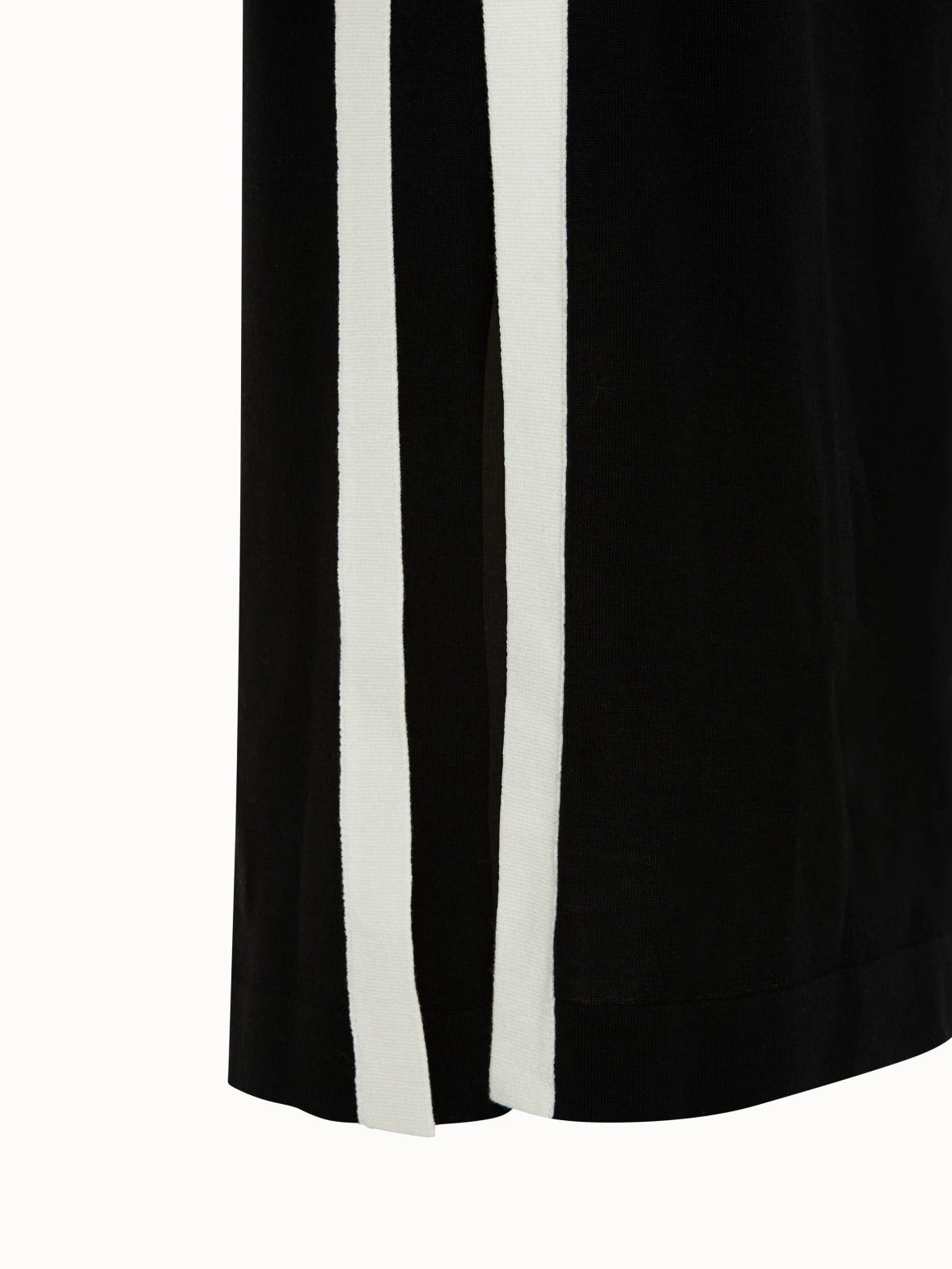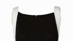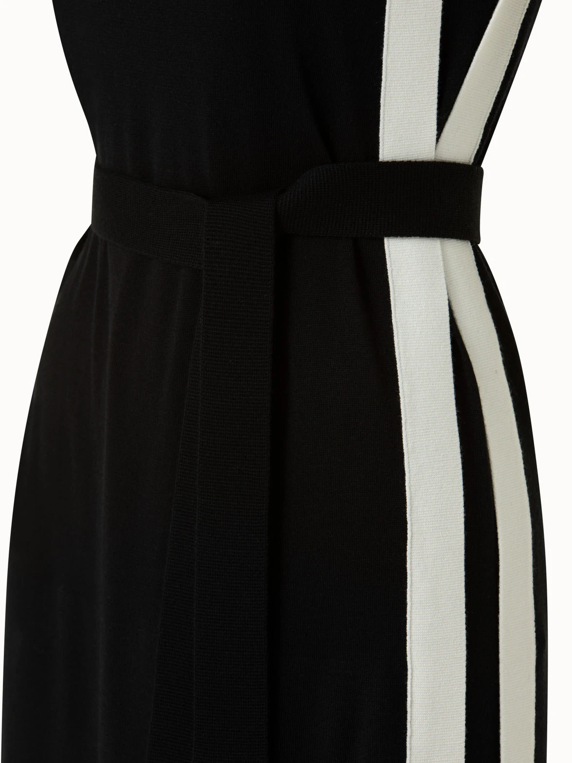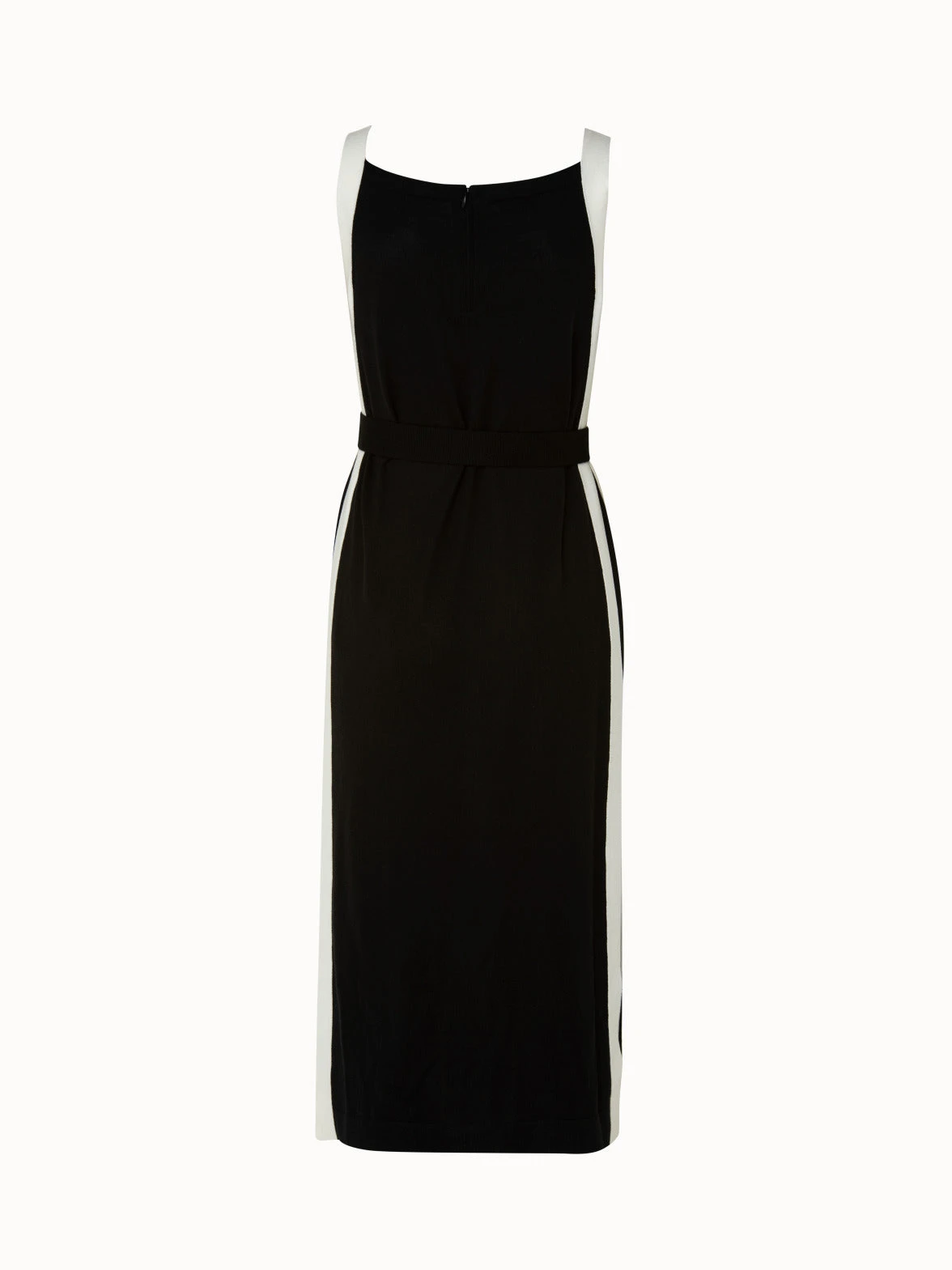 Highlighting the monochrome elegance of the collection, this Akris sleeveless midi dress is knitted from a luxurious wool silk blend. A contrast tape is running down the silhouette to finish at the hem. The dress can be cinched at the waist by the matching knit belt to accentuate the femininity of the side slits. The dress features a contemporary square neck for perfectly polished style.